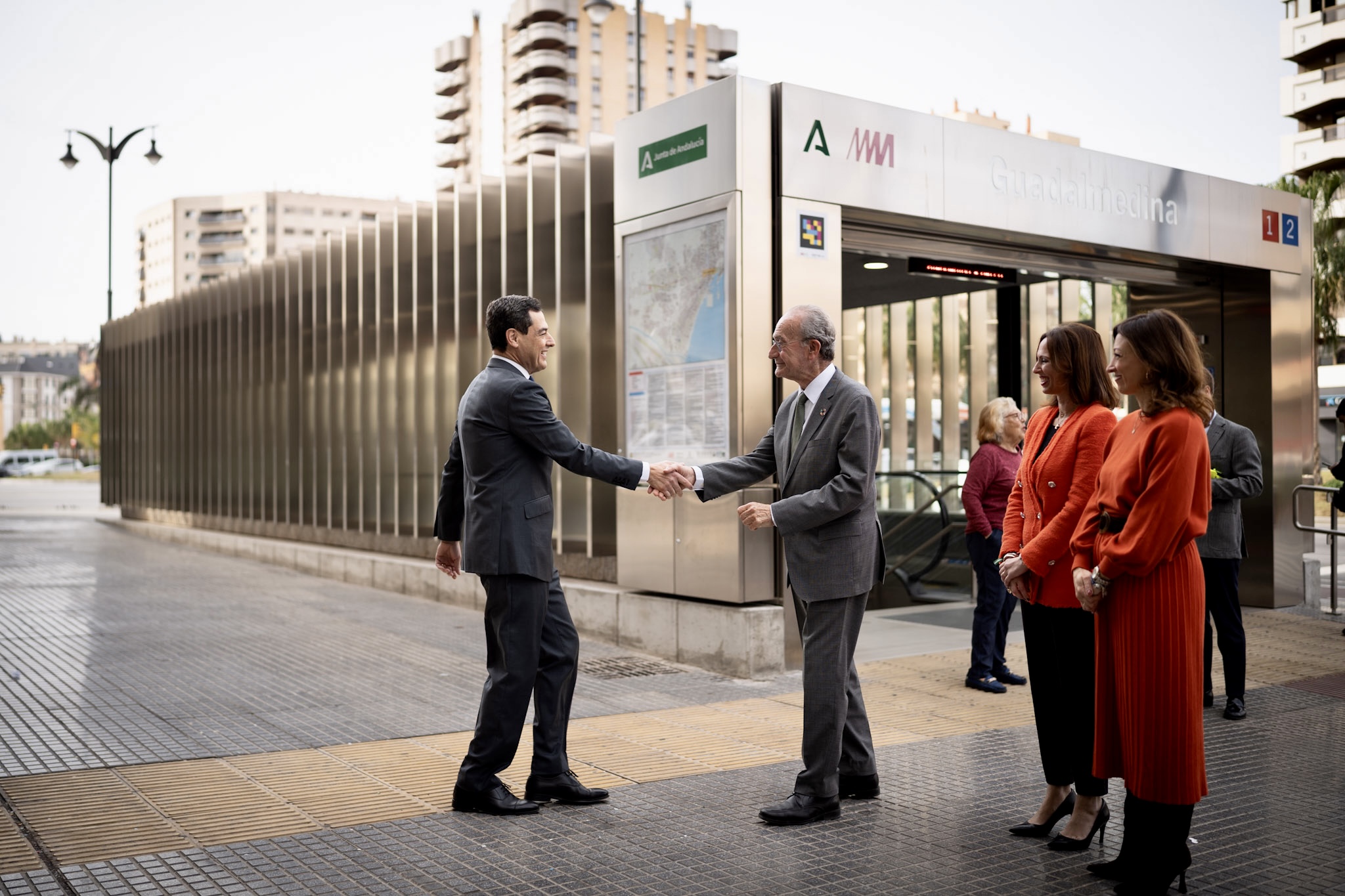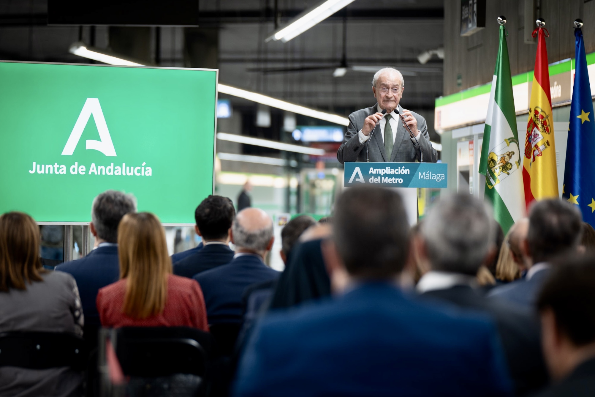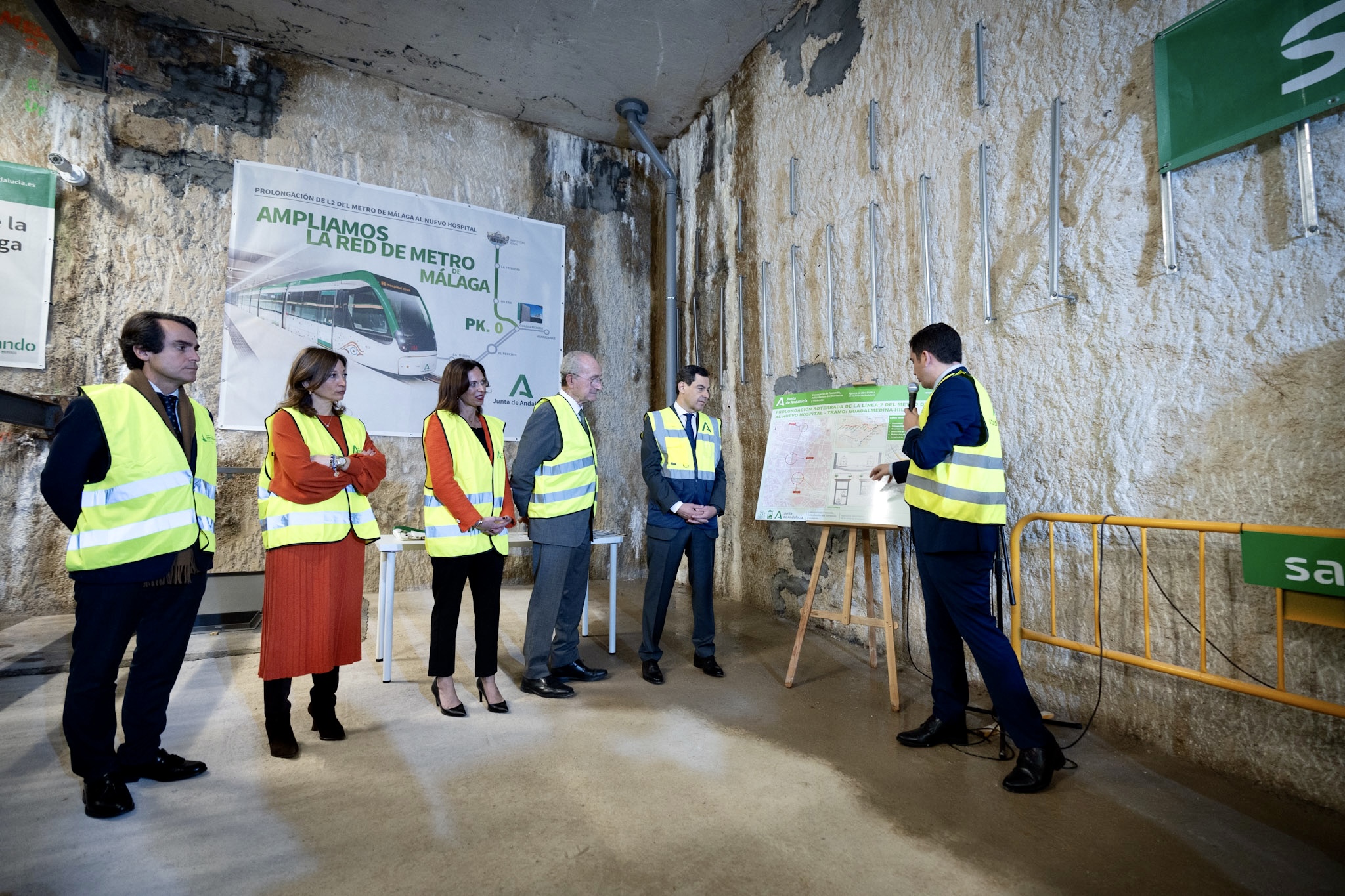 El alcalde de Málaga, Francisco de la Torre, junto al presidente de la Junta de Andalucía, Juan Manuel Moreno, ha asistido esta mañana al acto con motivo del inicio de las obras del metro del tramo Guadalmedina-calle Hilera, prolongación de la línea 2, que se ha desarrollado en la estación de Guadalmedina,
