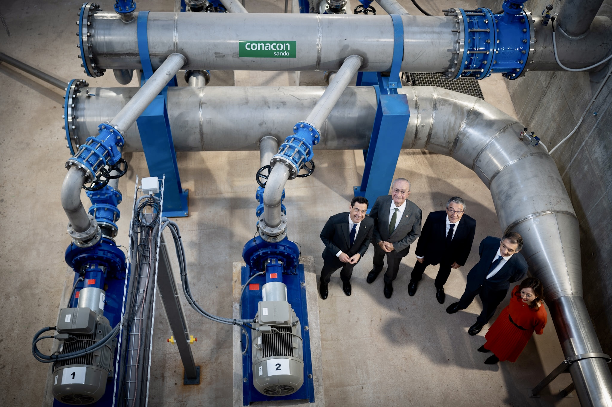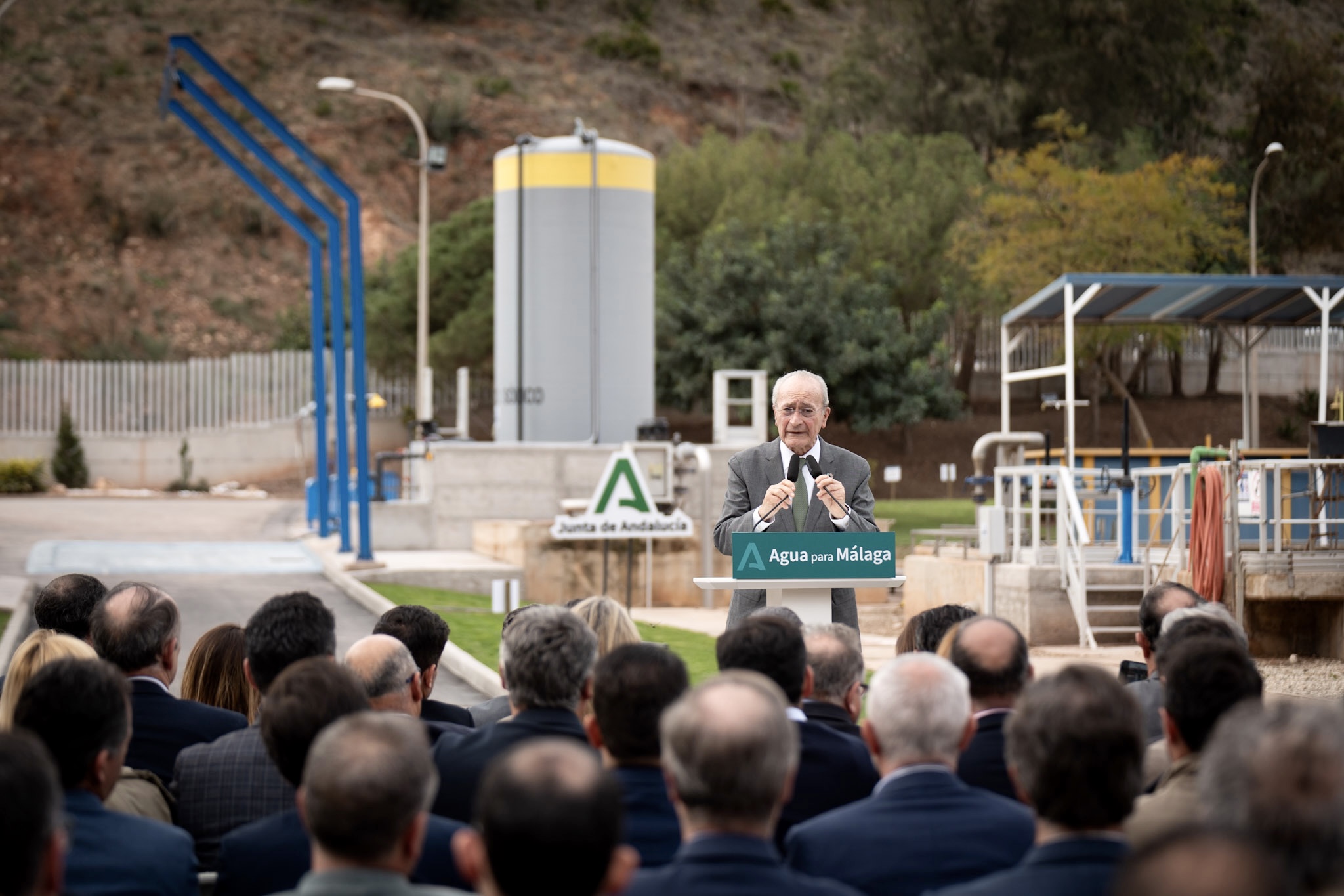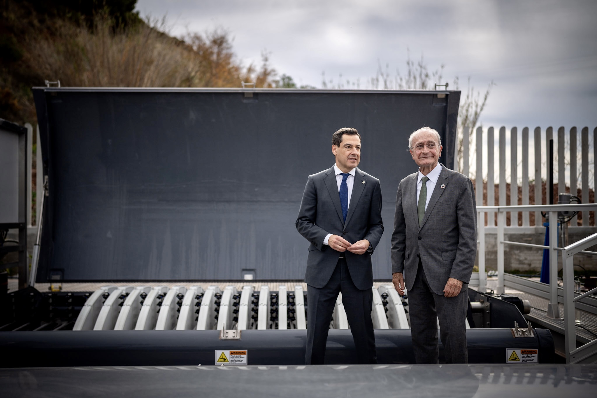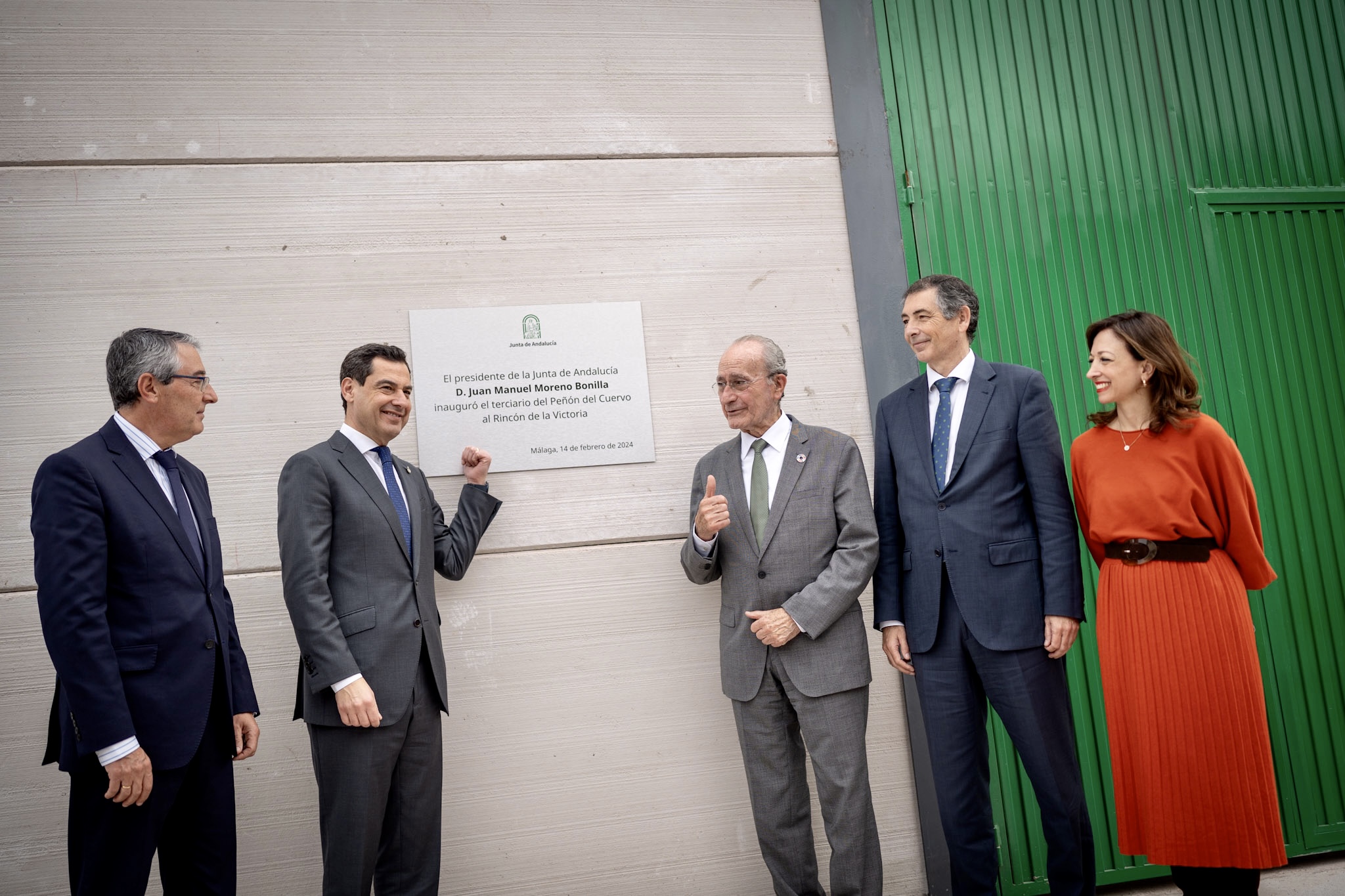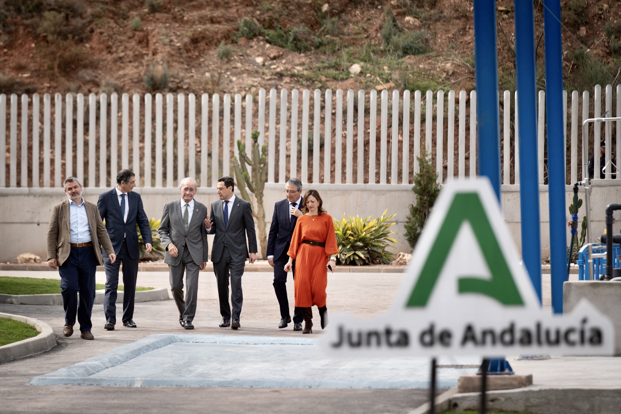 El alcalde de Málaga, Francisco de la Torre, junto al presidente de la Junta de Andalucía, Juanma Moreno, ha asistido esta mañana al acto de inauguración y puesta en servicio de la planta de tratamiento terciario de la Estación Depuradora de Aguas Residuales (EDAR) de Peñón del Cuervo. Las obras, ejecutadas y financiadas por la Junta de Andalucía con la colaboración técnica del Ayuntamiento de Málaga a través de la Empresa Municipal de Aguas (Emasa), permiten suministrar agua regenerada para el riego de cultivos de la Axarquía y de zonas verdes de la capital.