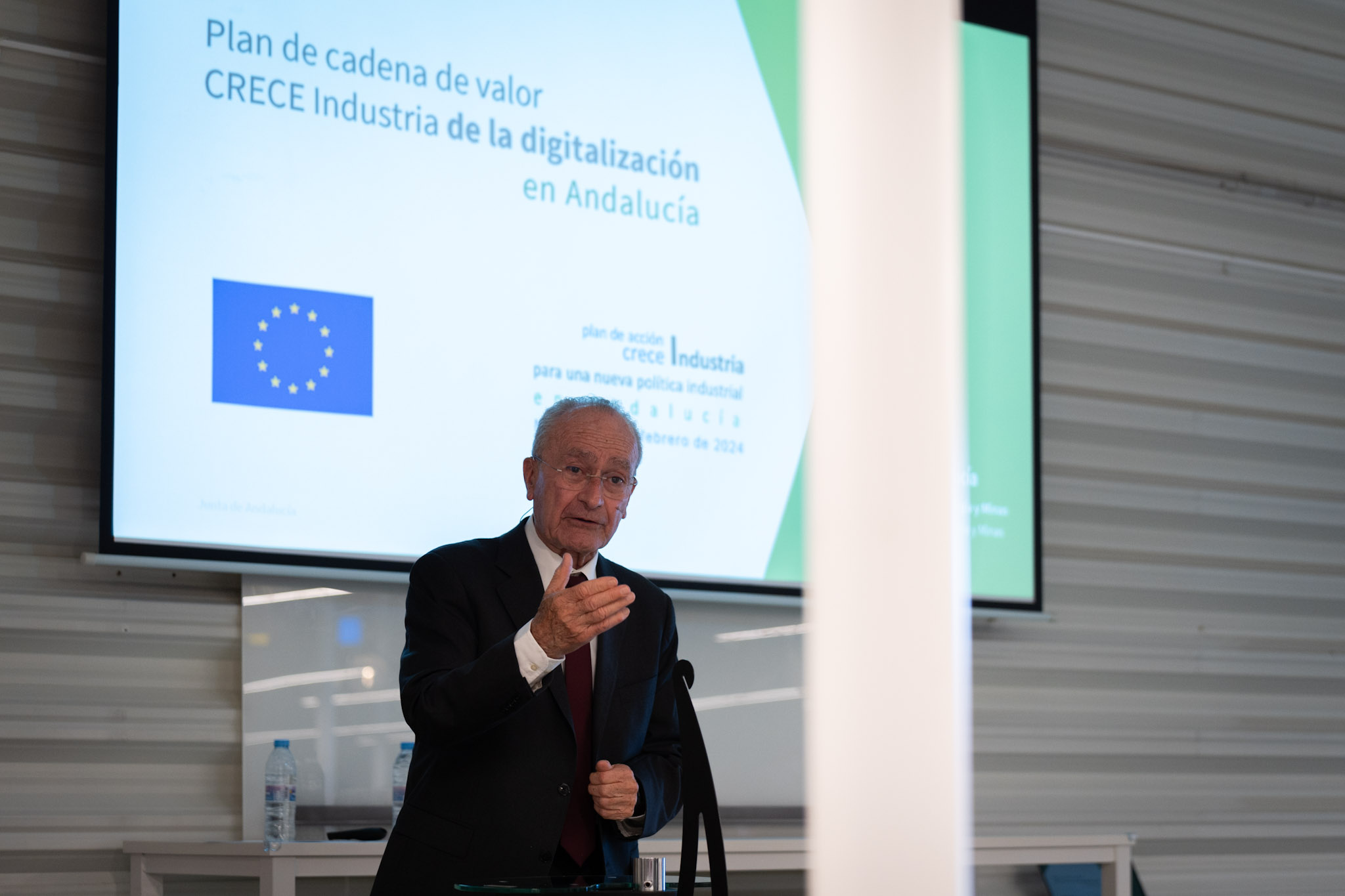 El alcalde de Málaga, Francisco de la Torre, junto a la concejala de Innovación, Digitalización Urbana, Promoción de la Inversión Tecnológica y Empresarial y Captación de Inversiones, Alicia Izquierdo, y el consejero de Industria, Energía y Minas de la Junta de Andalucía, Jorge Paradela, ha participado en la presentación del Plan de Cadena de Valor CRECE Industria de la digitalización en Andalucía, en Málaga Tech