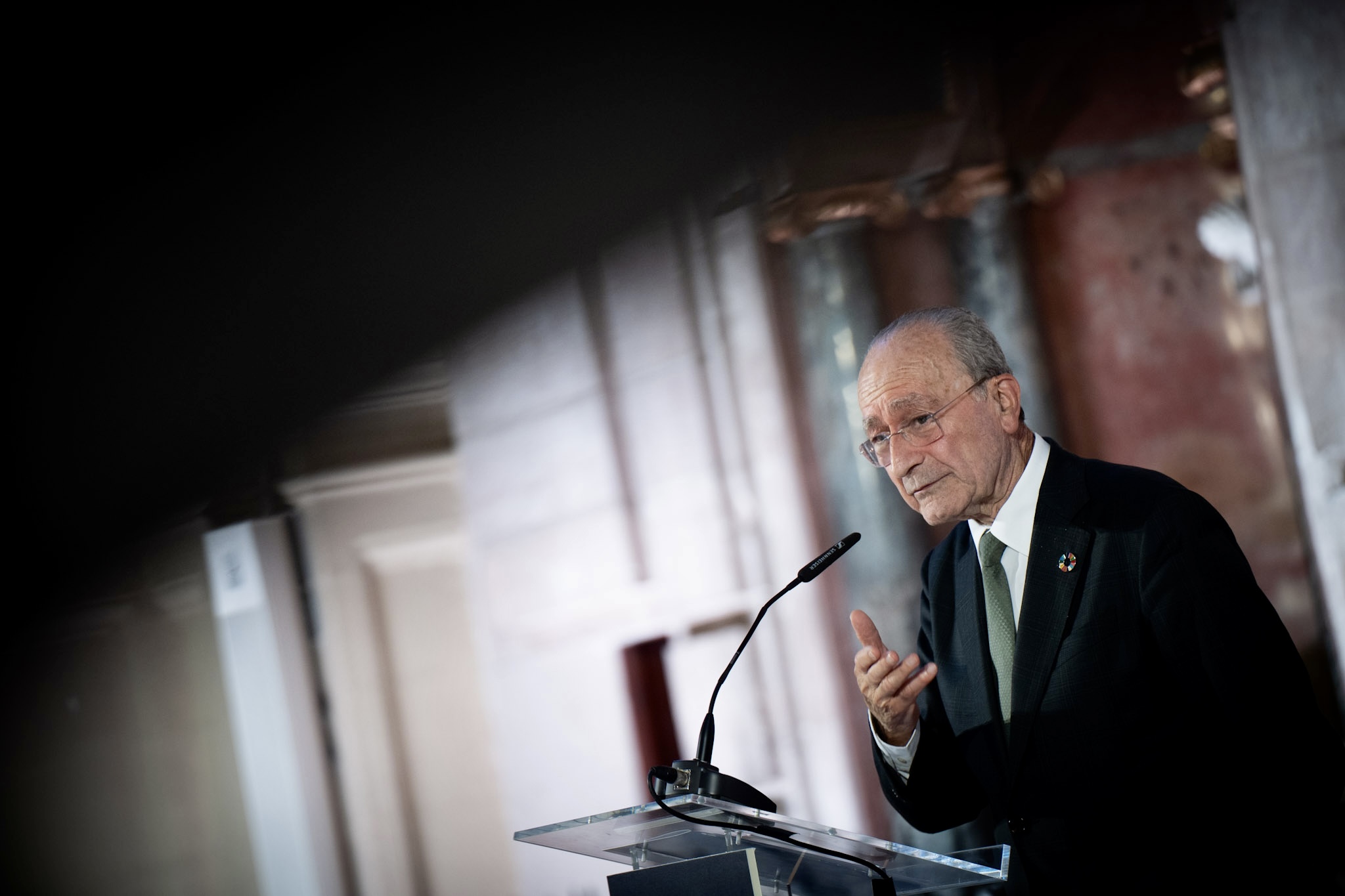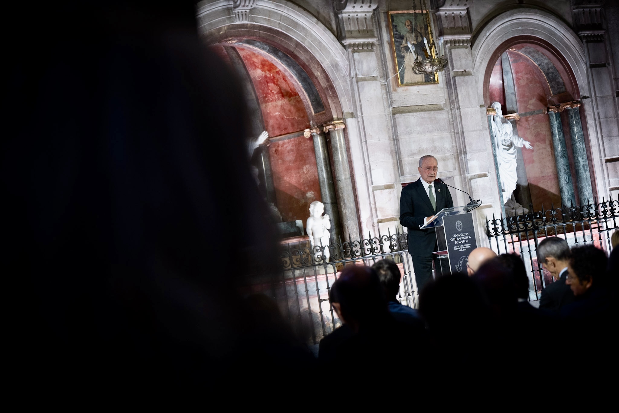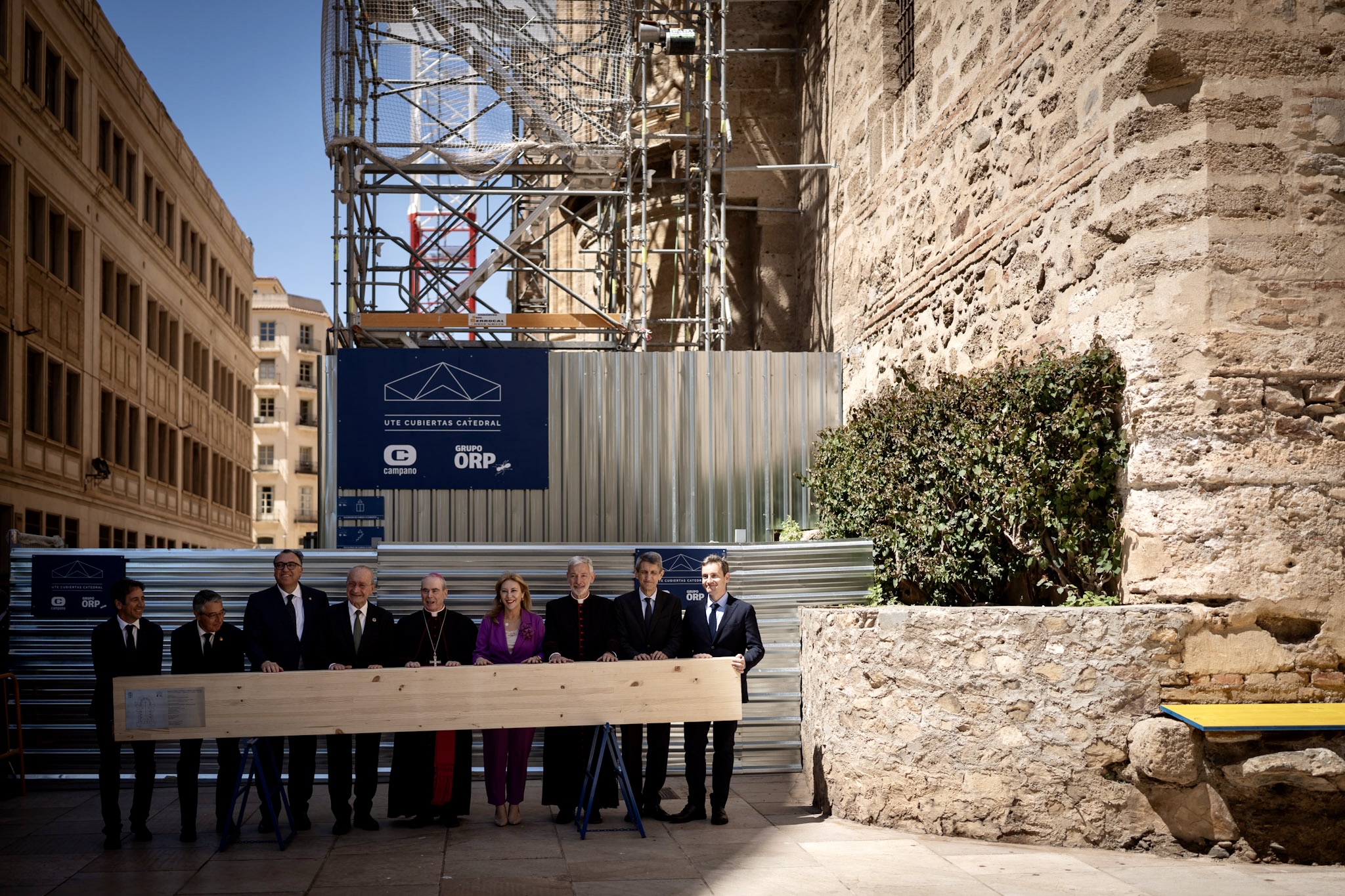 El alcalde de Málaga, Francisco de la Torre, junto al Obispo de Málaga, Jesús Catalá, ha participado esta mañana en el acto de izado de la primera de las vigas que conforman el nuevo tejado de la Catedral de la Encarnación de Málaga.