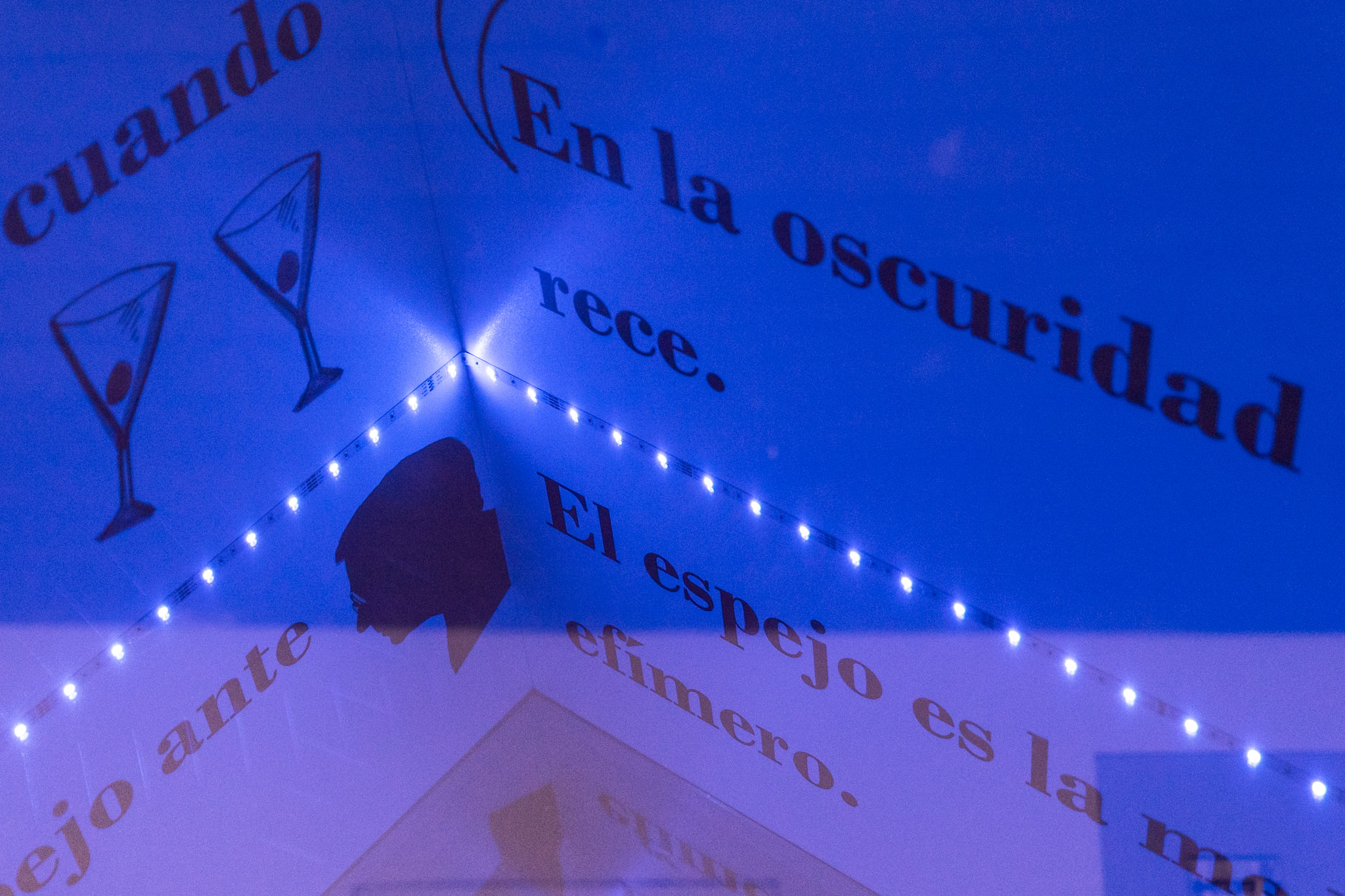 Esta pieza formará parte del equipamiento permanente de la biblioteca e invita a descubrir el universo artístico del autor malagueño a través del uso de espejos y luces emulando una sensación de infinito con parte de la obra literaria de Rafael Pérez Estrada