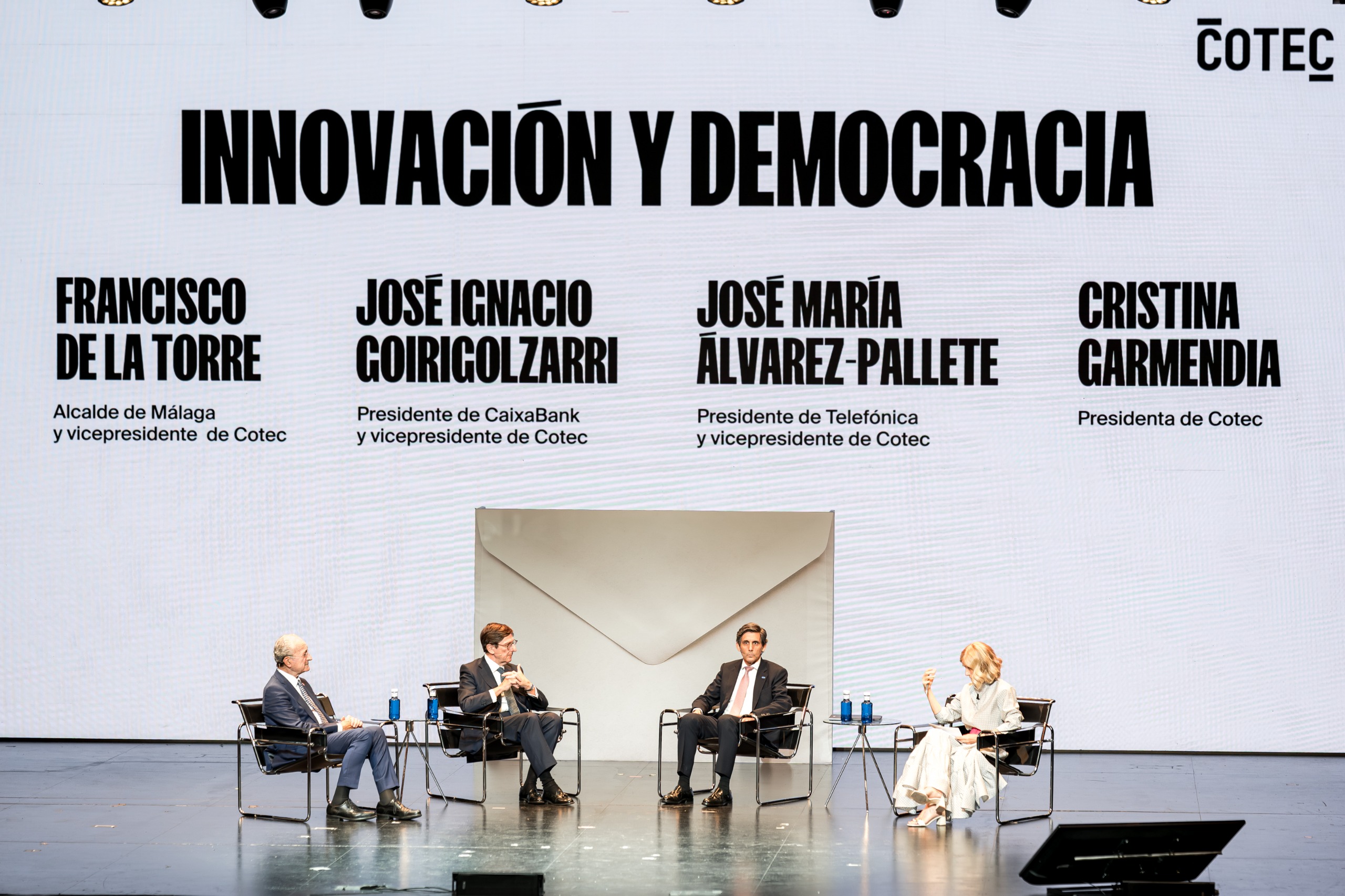 En la mesa de debate, que ha girado en torno al binomio innovación y democracia y que ha sido moderada por la presidenta de Cotec, Cristina Garmendia, también han participado José María Álvarez-Pallete, presidente de Telefónica, y José Ignacio Goirigolzarri, presidente de Caixabank.