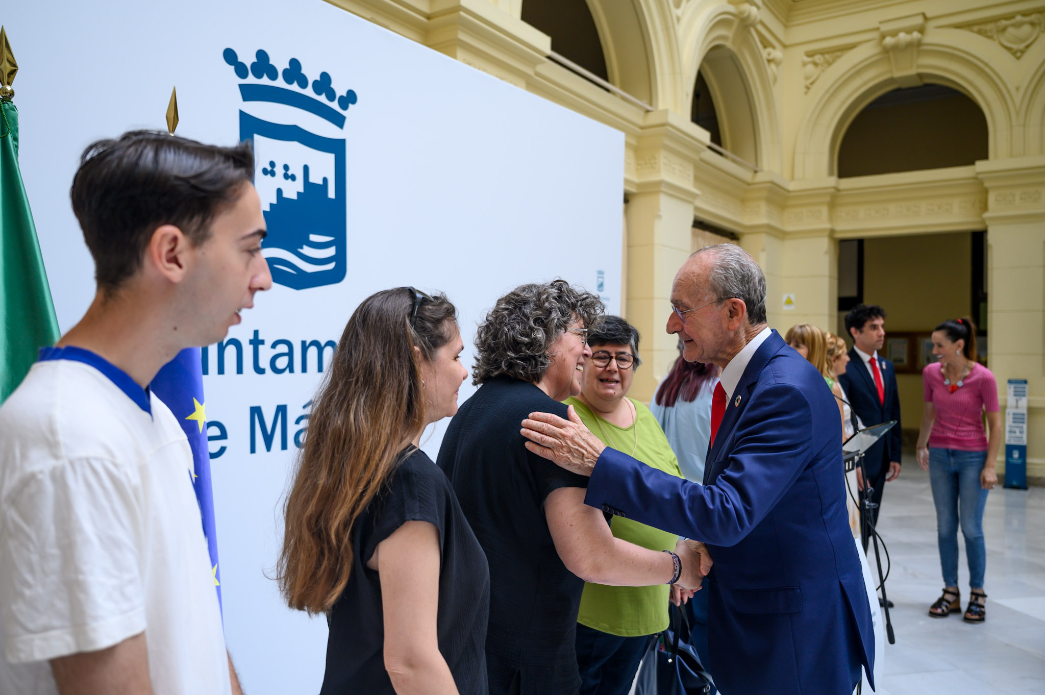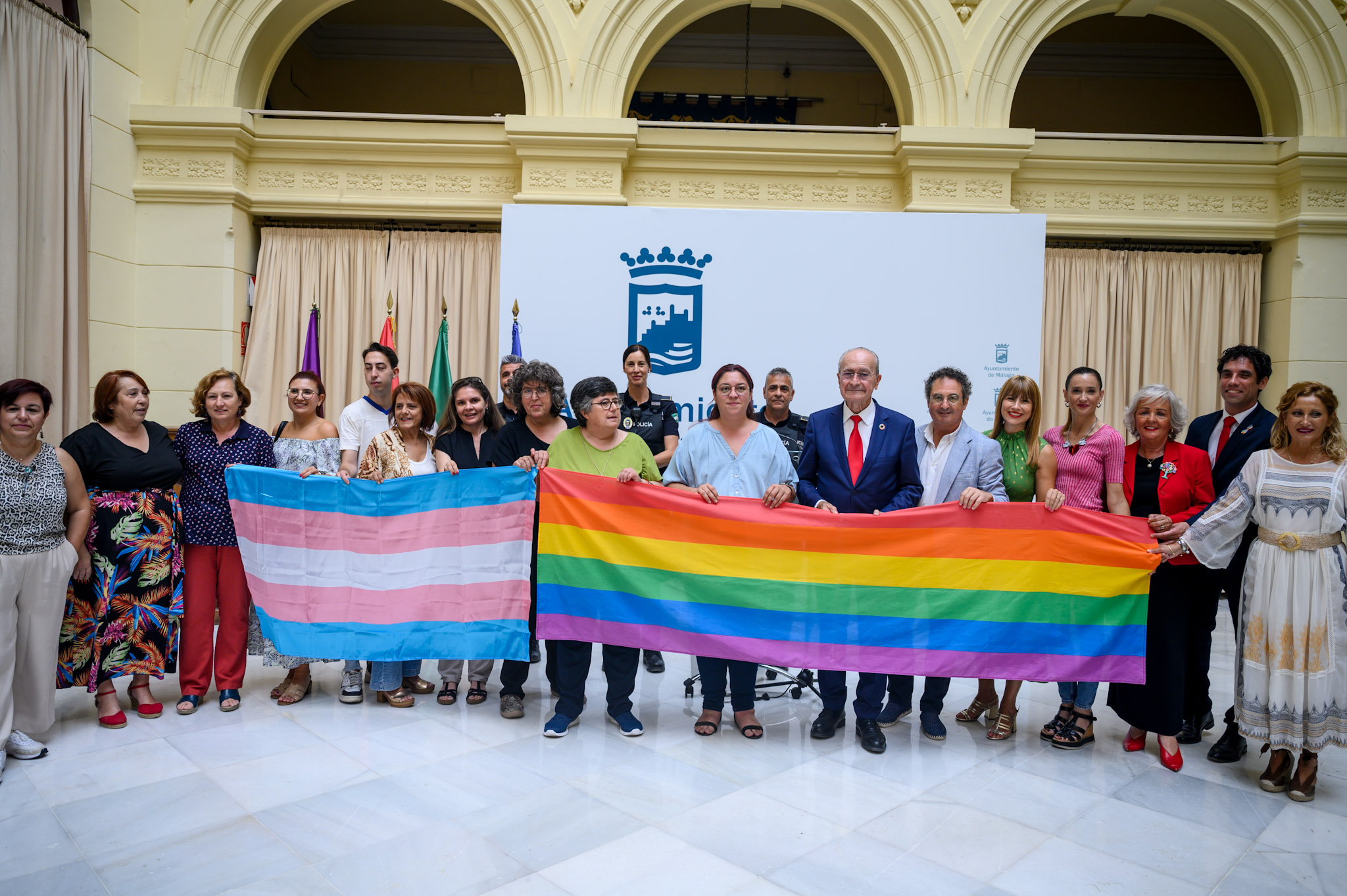 El alcalde de Málaga, Francisco de la Torre, junto al concejal delegado de Derechos Sociales, Francisco Cantos, a otros concejales de la Corporación Municipal, y a la delegada de Inclusión Social de la Junta de Andalucía, Ruth Sarabia, ha asistido al acto organizado por el Ayuntamiento y la Agrupación de Desarrollo LGTBI con motivo del Día Internacional del Orgullo, que se conmemora hoy 28 de junio. Desde el pasado miércoles y hasta el próximo domingo la bandera LGTBI permanece izada en el mástil situado junto a la escalinata del Consistorio y durante los días 28, 29 y 30 se iluminará la fachada con los colores representativos del colectivo. Además, para mañana sábado se han programado varias iniciativas. Así, a partir de las 18:30 horas está previsto el comienzo de una manifestación desde la plaza de la Constitución que, con el lema ‘Nuestros derechos no se tocan’, recorrerá las principales calles del Centro para finalizar en la explanada situada junto al CAC Málaga. Una vez concluida la marcha, sobre las 20:00 horas, se procederá a la lectura del manifiesto. Posteriormente, dará comienzo la celebración del Orgullo 2024 con actuaciones y música en directo hasta las 00:00 horas. El evento contará con las actuaciones de Adriana Rogan, Suzette Moncrief, Tony Núñez, Asociación Coro LGTBI Torremolinos y el coro Rainbow Voices; así como del DJ Danny Ruiz y delas drag queen Alice Wonderland, Lola Spain y Suhaula Conache.