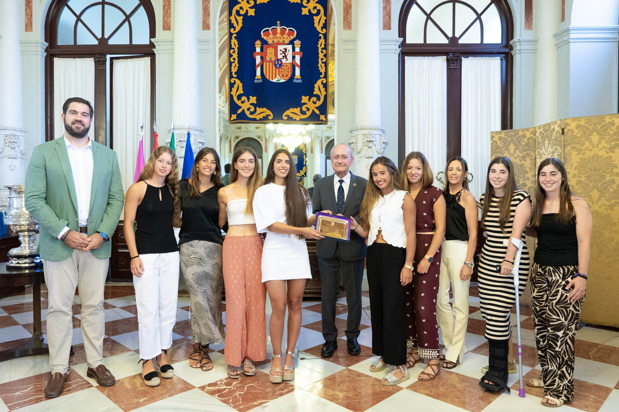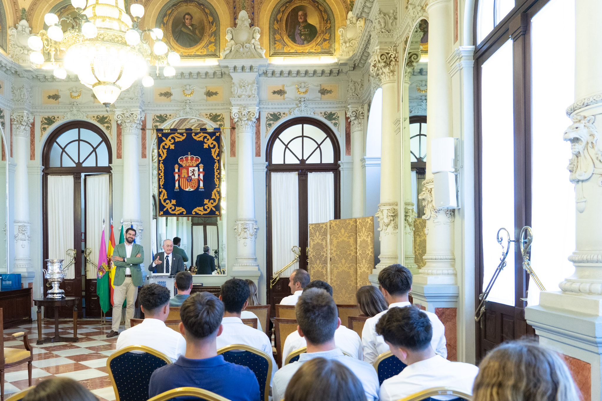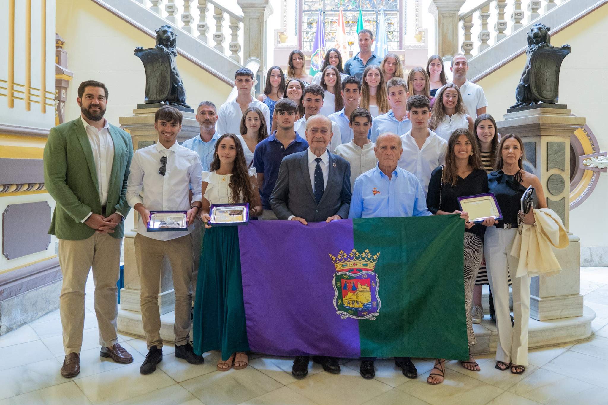 El alcalde de Málaga, Francisco de la Torre, junto al concejal de Deporte, Borja Vivas, ha recibido a los deportistas y el cuerpo técnico que integra el equipo de Remo del Real Club Mediterráneo, que se ha proclamado ganador del Campeonato de Banco Fijo del Mediterráneo-Llaüts. En el acto también han estado presentes el presidente del Real Club Mediterráneo, Eduardo Cestino, y los entrenadores Antonio Cáliz y Victorio Nicolás, entre otros integrantes del club.