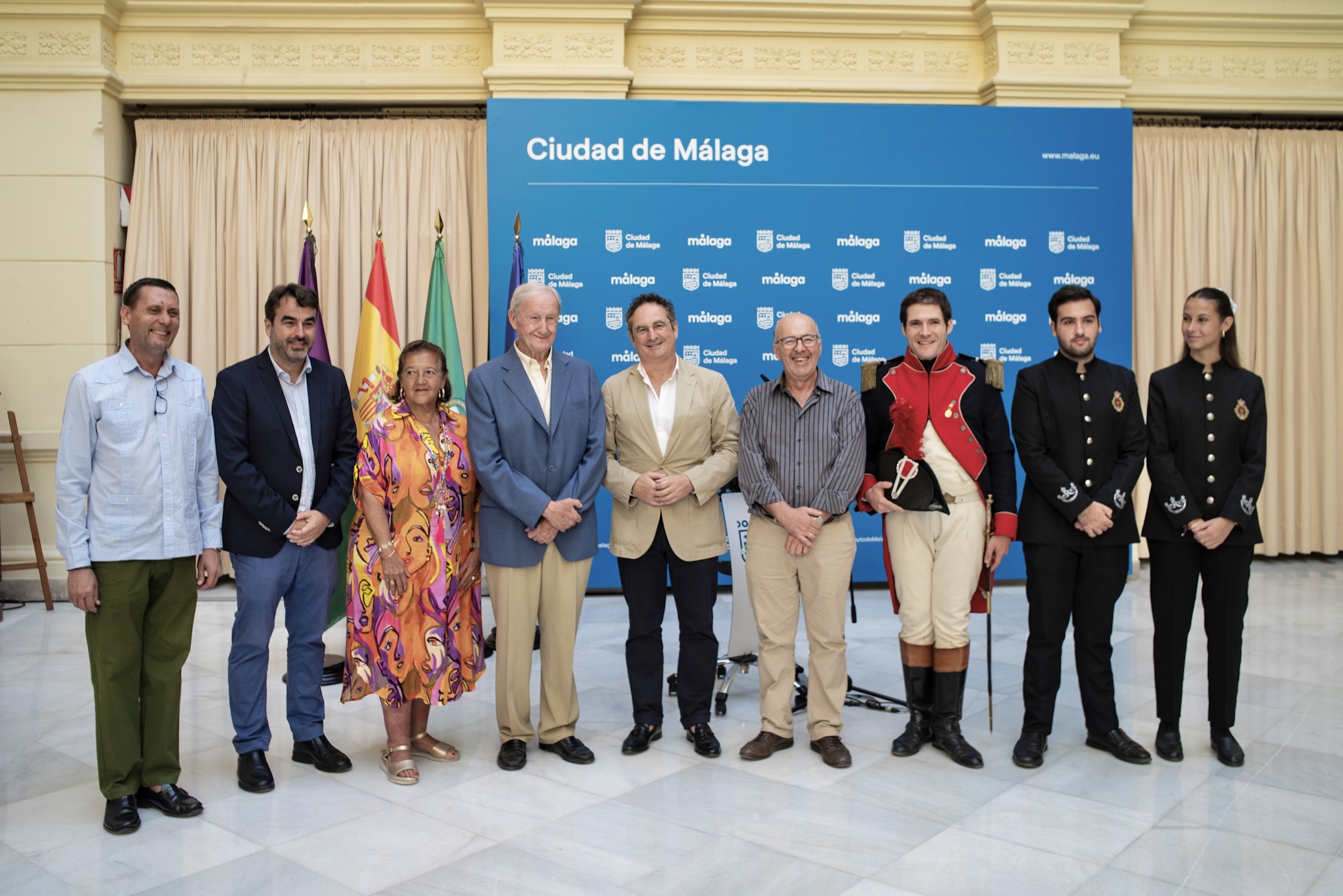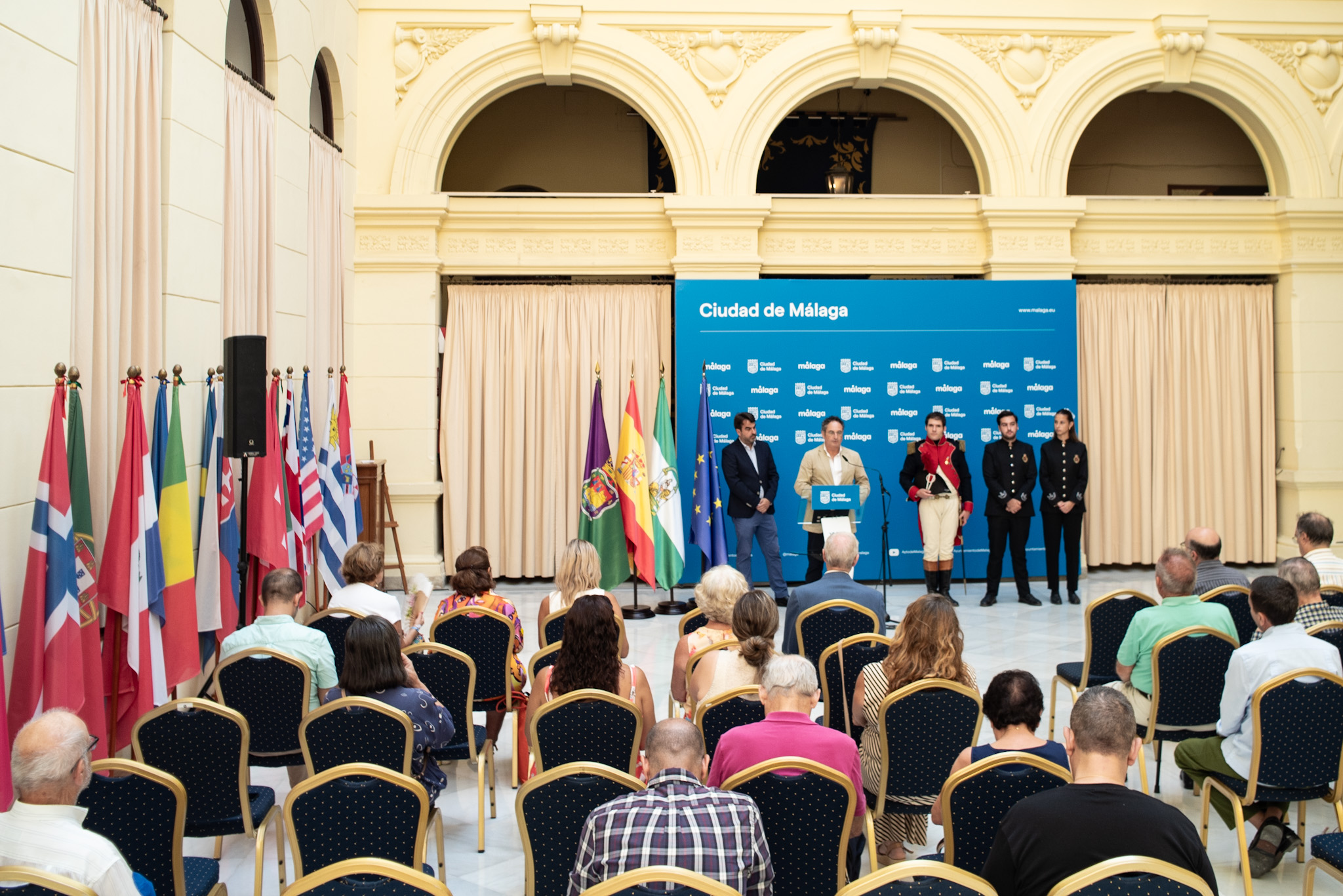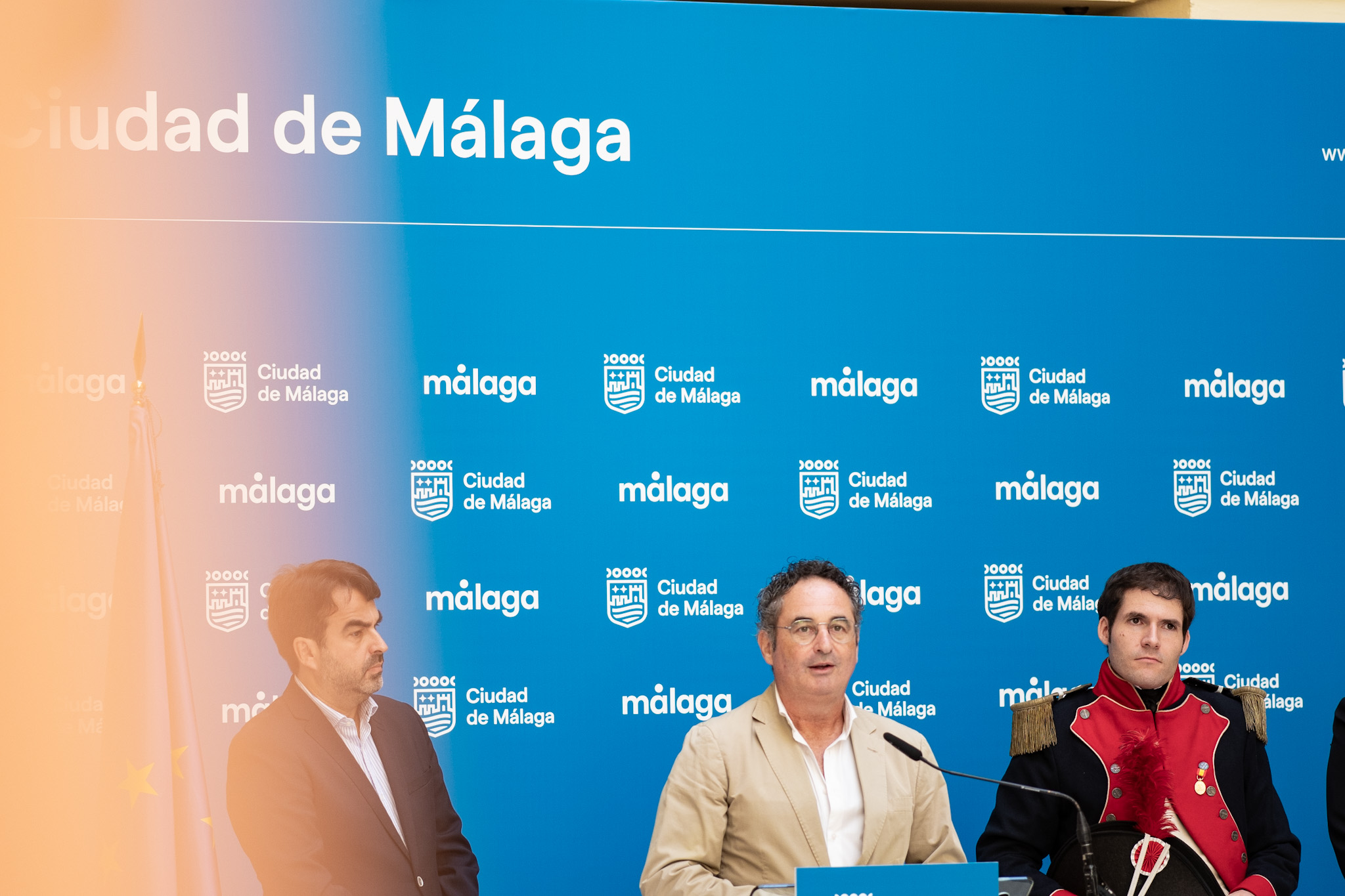 El concejal delegado del distrito Centro, Francisco Cantos, acompañado del presidente de la asociación Pro Tradicionales Malagueñas "La Coracha", Juan Miguel Ferrer, ha asistido hoy en el Patio de Banderas del Ayuntamiento a la presentación de las actividades organizadas con motivo de la celebración del día de la Virgen de la Victoria de este año.
