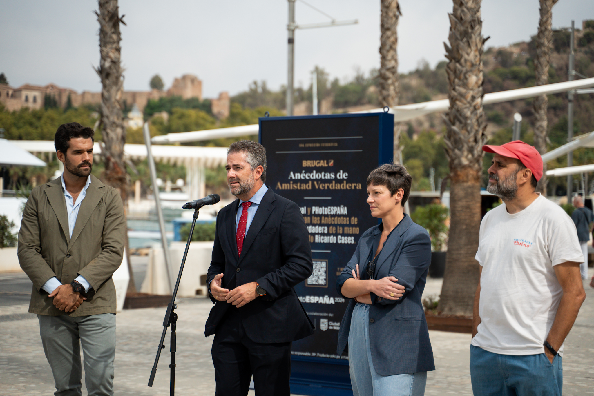 El concejal delegado de Economía, Hacienda y Fondos de la UE, Carlos Conde, junto al fotógrafo de la muestra, Ricardo Cases, la directora de PHotoESPAÑA, María Santoyo, y el Brand Ambassador de Brugal Andalucía, Fernando Altés, ha asistido a la presentación de la exposición "Anécdotas de Amistad Verdadera". La muestra es un selección de trabajos del fotógrafo Ricardo Cases, que ha llevado a cabo un proyecto cultural basado en captar imágenes de momentos compartidos por grupos de amigos reales de diversas provincias españolas. La exposición se podrá visitar en el Muelle Uno del Puerto de Málaga desde el 24 de septiembre al 8 deoctubre.
