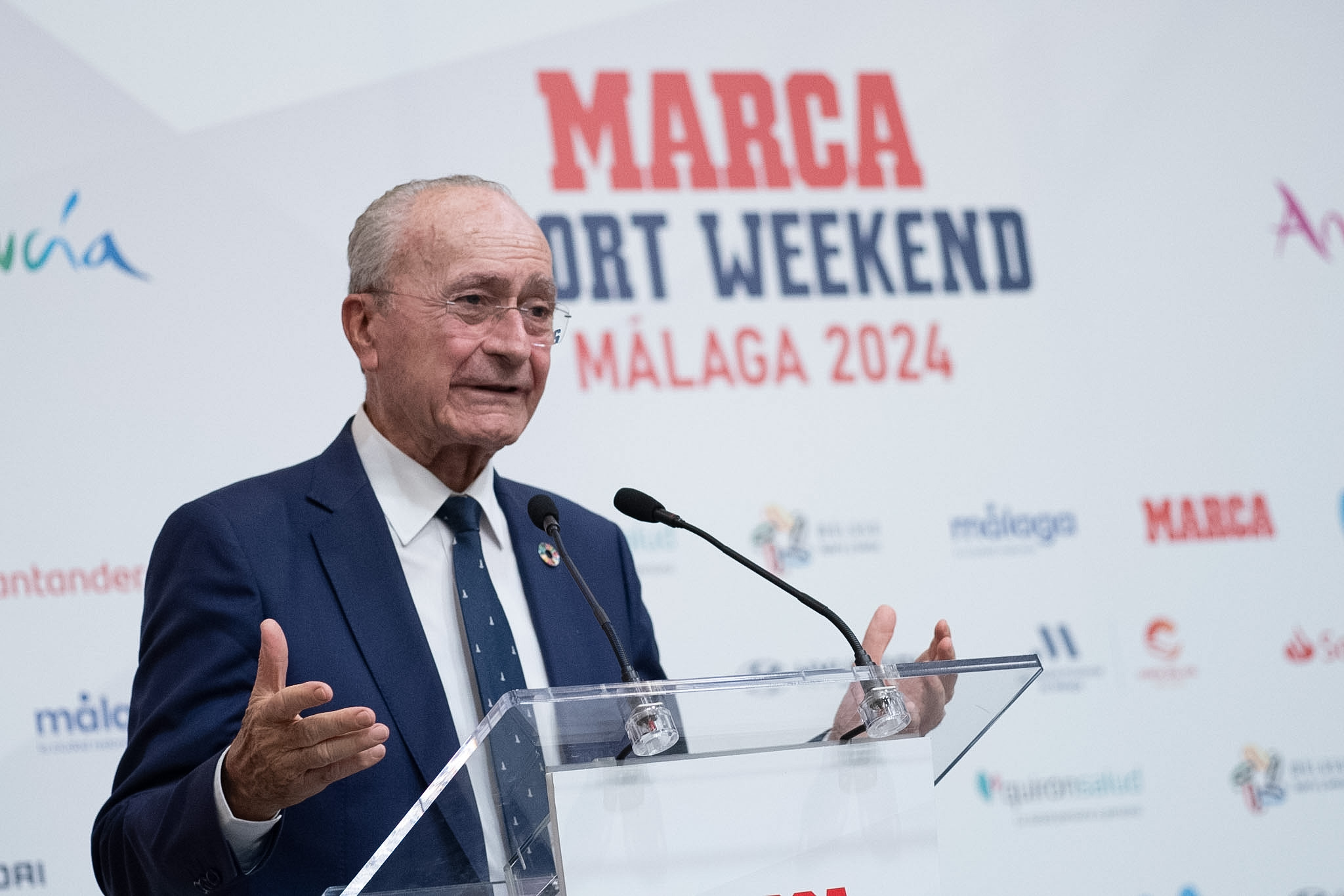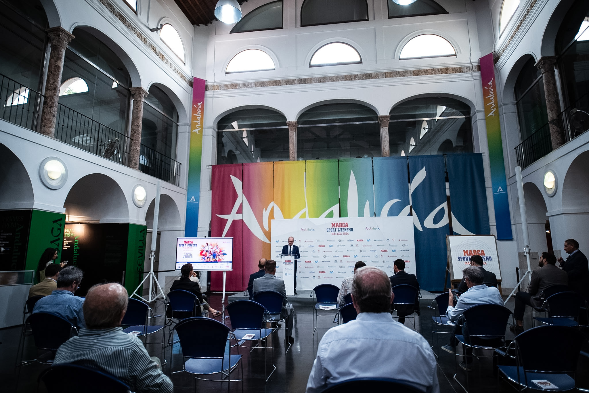 El alcalde de Málaga, Francisco de la Torre, junto al concejal delegado de Deporte, Borja Vivas; al secretario general para el Deporte de la Junta de Andalucía, José María Arrabal; el director de Marca, Juan Ignacio Gallardo; y la directora de Negocio, Gema Monjas, ha asistido esta mañana a la presentación de ‘Marca Sport Weekend 2024’.
