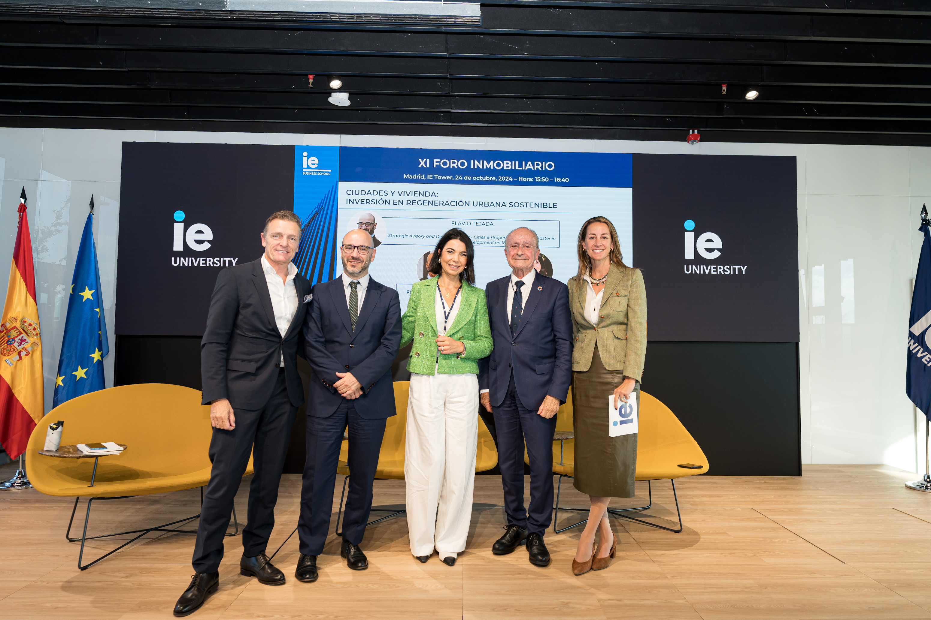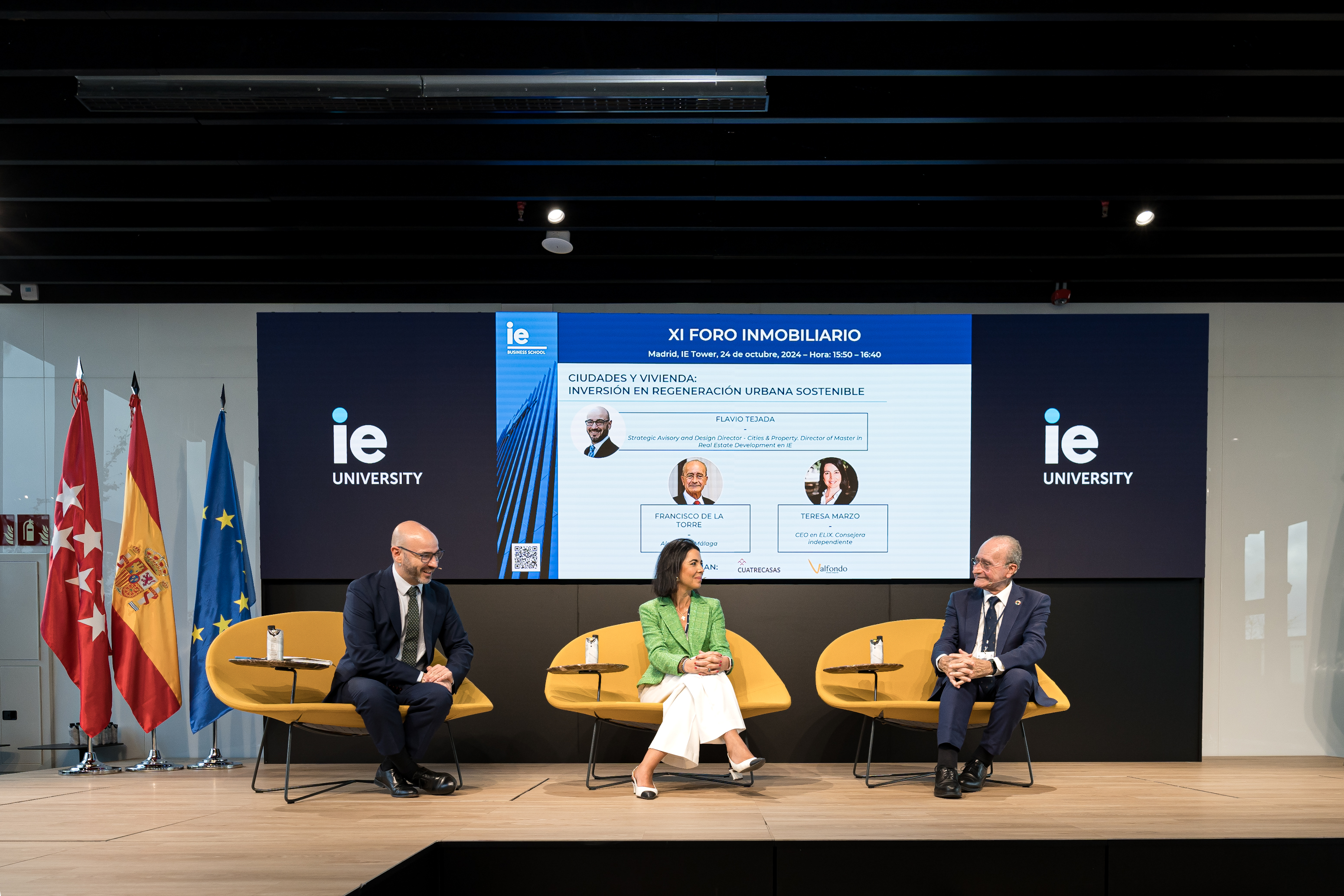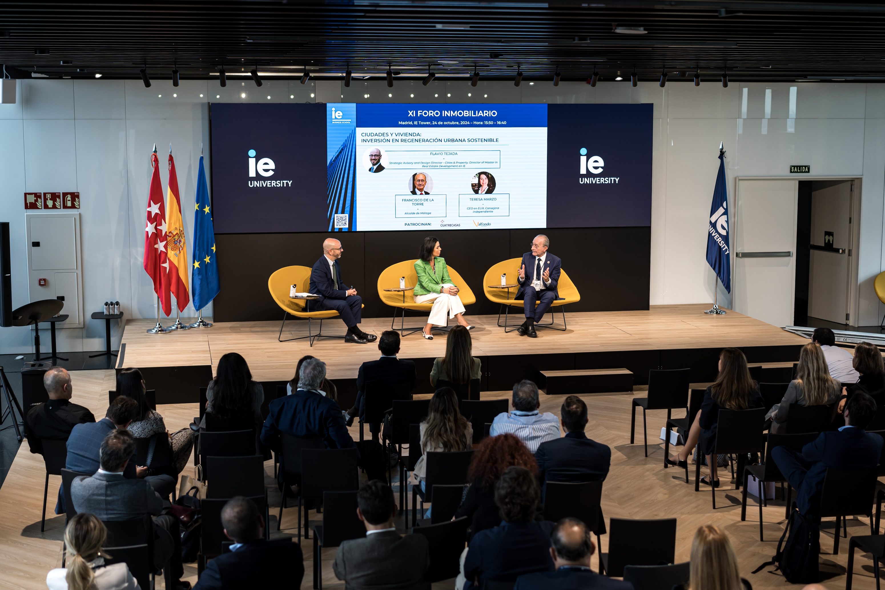 El alcalde de Málaga, Francisco de la Torre, ha intervenido esta tarde en la mesa redonda "Ciudades y vivienda. Inversión en regeneración urbana sostenible", dentro del XI Foro Inmobiliario organizado por IE Business School, junto a la CEO de Elix, Teresa Marzo, y al director del Máster en Real estate development (MRED) en IE, Flavio Tejada.