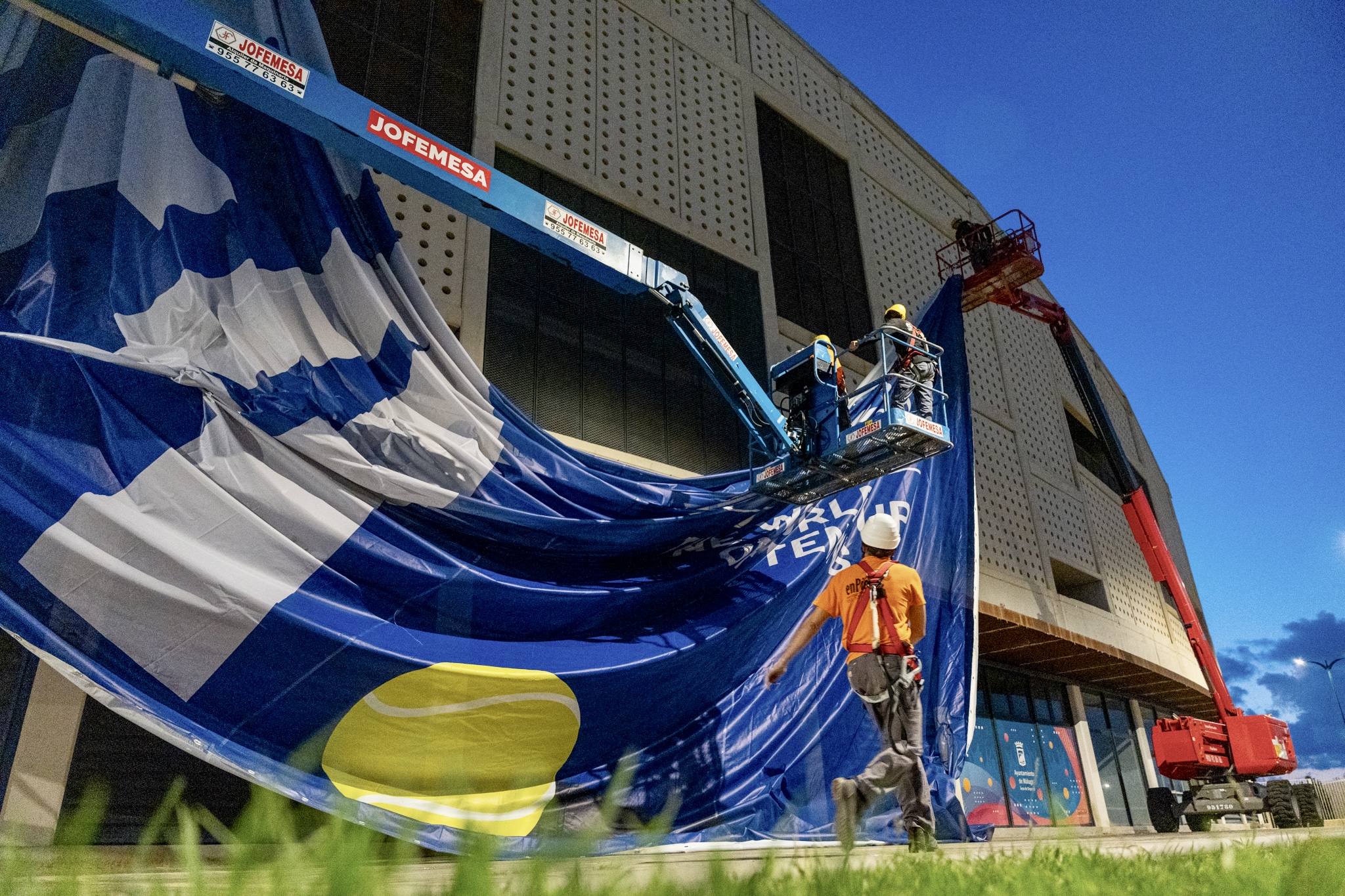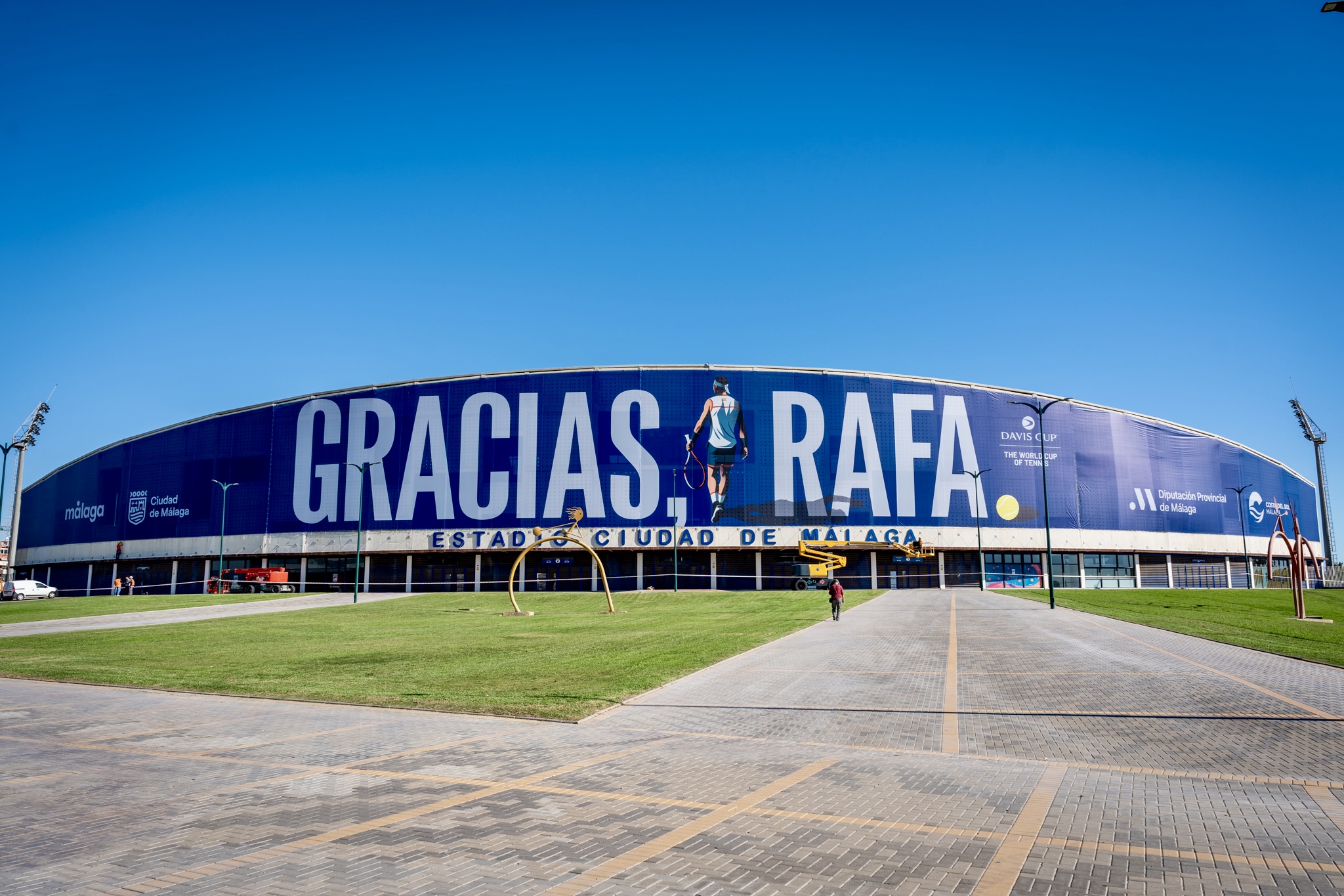 frontal del Estadio de Atletismo Ciudad de Málaga y con una figura de Nadal de casi 15 metros de
