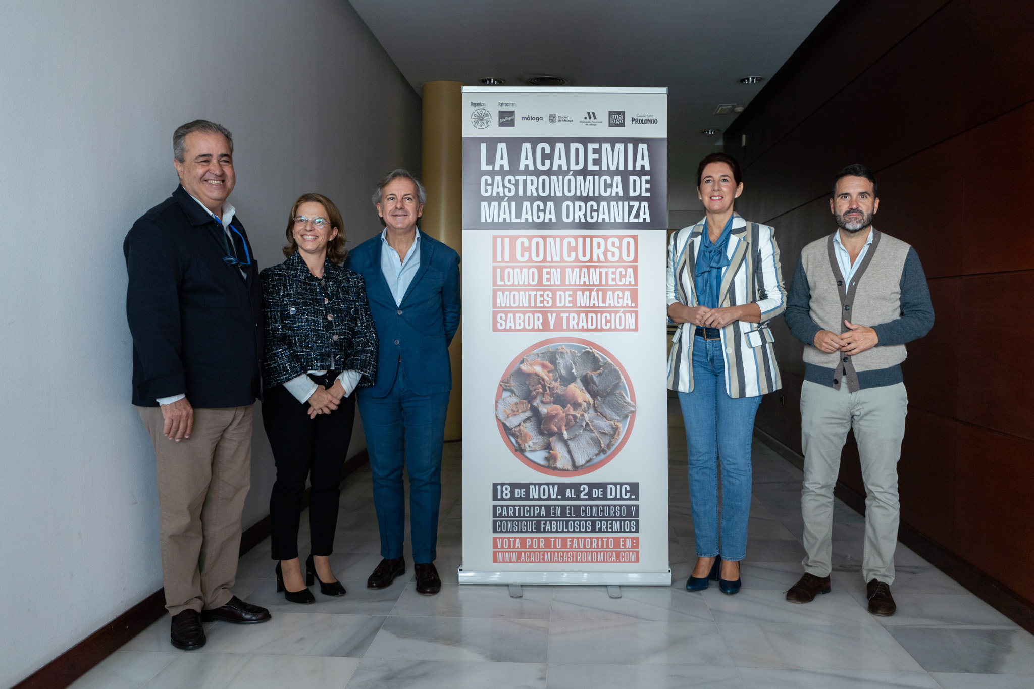 El concejal delegado de Turismo y Promoción de la Ciudad, Jacobo Florido, junto a la vicepresidenta tercera de la Diputación de Málaga, Antonia Ledesma; el presidente de la Academia Gastronómica de Málaga, Manolo Tornay; el responsable de Trade MK regional de Mahou-San Miguel, Miguel de Hoyos, y la directora financiera de Prolongo-Faccsa, María Dolores Soler, ha presentado el ‘II Concurso de Lomo en Manteca Montes de Málaga. Sabor y Tradición’, que se celebrará del 18 de noviembre al 2 de diciembre. Los 14 restaurantes que participan en el certamen son los siguientes: Venta Los Atanores; Venta Las Brasas; Venta Galwey; Venta Fuente de la Reina; Venta El Túnel; Venta El Boticario; Trepaolla; Restaurante La Minillas; Restaurante Balcón de Los Montes; Nerva; El Puerto del León; Casa Vázquez; Bar Ternero; y Bar Roper. El ‘II Concurso de Lomo en Manteca Montes de Málaga. Sabor y Tradición’ está promovido por la Academia Gastronómica de Málaga y cuenta con el patrocinio del Ayuntamiento de Málaga, San Miguel, la Diputación Provincial de Málaga, Sabor a Málaga y Prolongo.