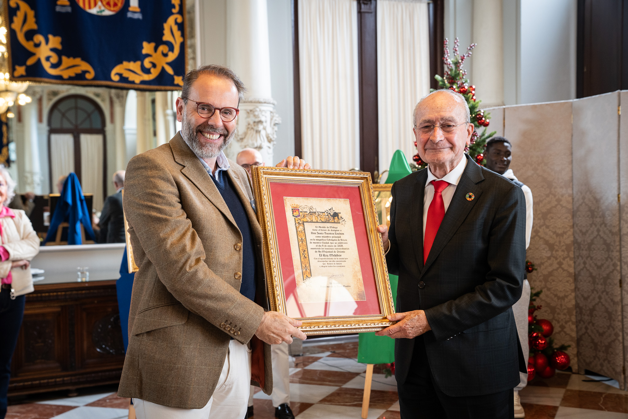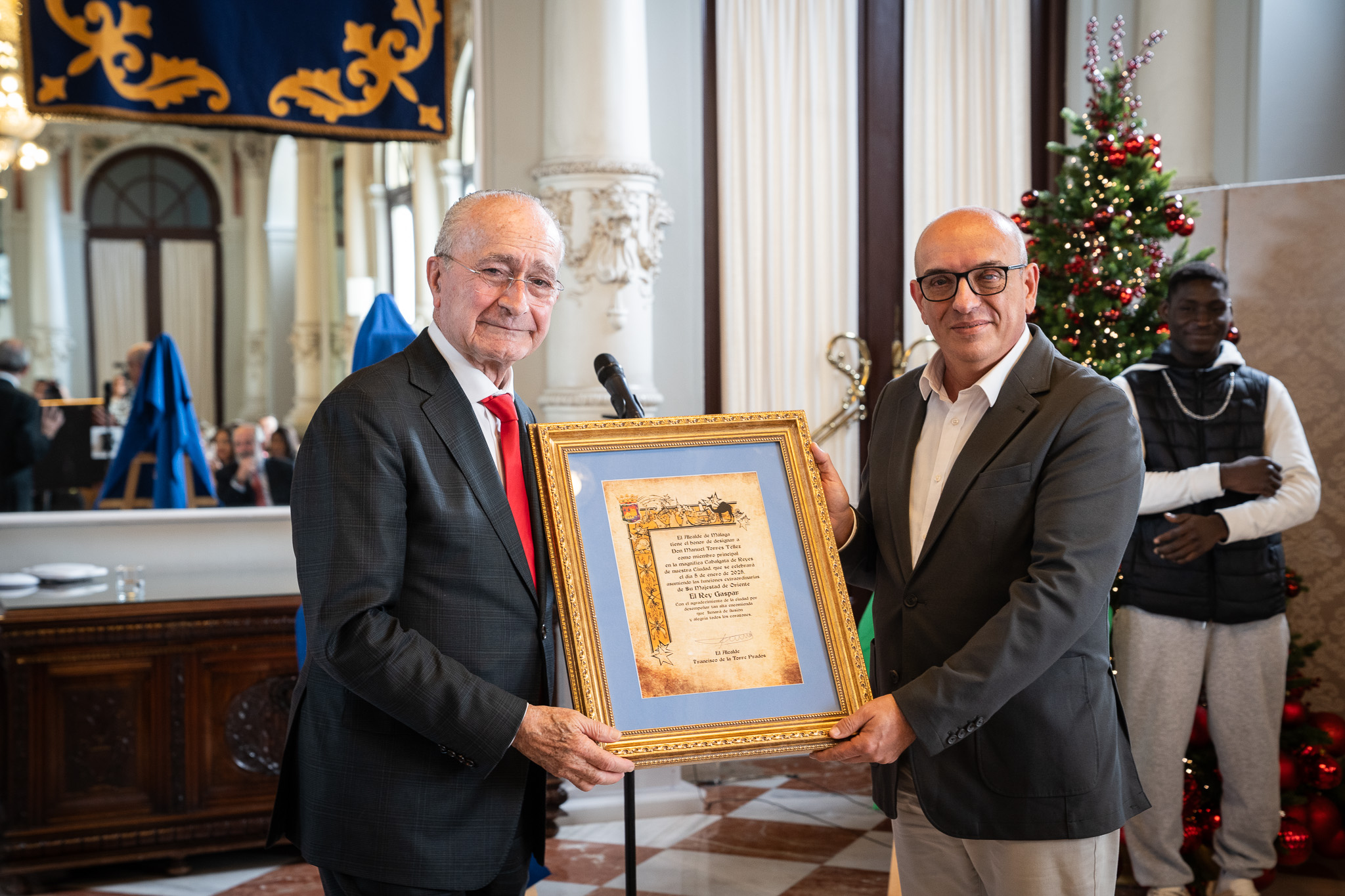 El acto se ha celebrado en el salón de los Espejos del Ayuntamiento. Los representantes de los Reyes Magos durante la cabalgata en Málaga son el director de COPE Málaga, Justo Fuentes, que encarnará al rey Melchor representando a los medios de comunicación; el hermano mayor de la Hermandad del Descendimiento y vicepresidente de la Agrupación de Cofradías, Manuel Torres Téllez, que encarnará al rey Gaspar a propuesta de la Agrupación de Cofradías; y Mansour Konte, el joven que protagonizó el rescate de una mujer atrapada por el agua durante la DANA este mes de noviembre, que encarnará al Rey Baltasar, según la propuesta acordada en la Junta de Portavoces, previa al pleno ordinario de noviembre.