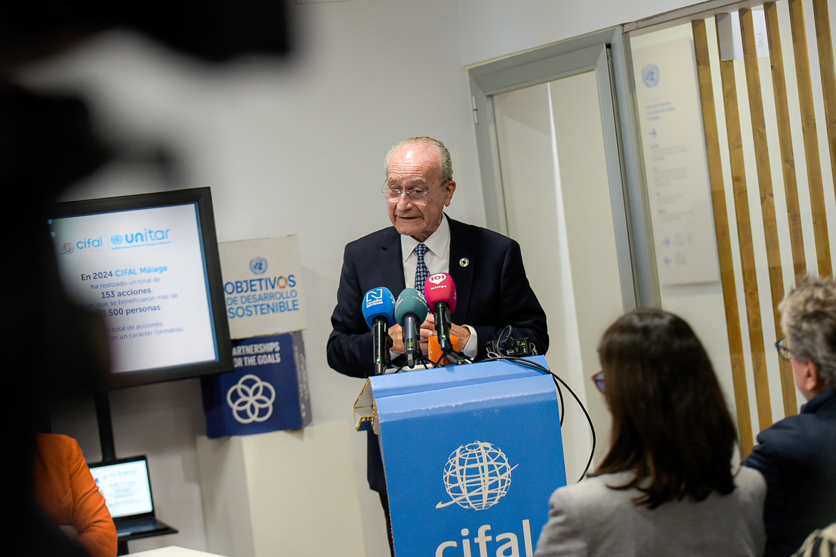 El alcalde de Málaga, Francisco de la Torre, junto a la concejala delegada de Acción Exterior, Mar Torres, ha asistido a la presentación de la memoria de actividades del Centro Internacional de Formación y Autoridades y Líderes (CIFAL) Málaga 2024, que ha tenido lugar esta mañana en la sede de la Casa de las Naciones Unidas en Málaga, situada en el Hospital Noble. En el acto también han participado la directora de CIFAL Málaga, Déborah Salafranca, y el rector de la Universidad de Málaga, Teodomiro López.