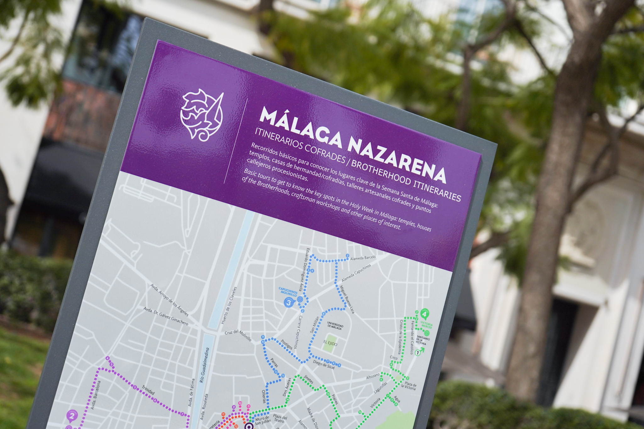 El Área de Turismo estrena la renovación de los 36 tótems de señalización de los itinerarios urbanos cofrades ´Málaga Nazarena´ para la Semana Santa