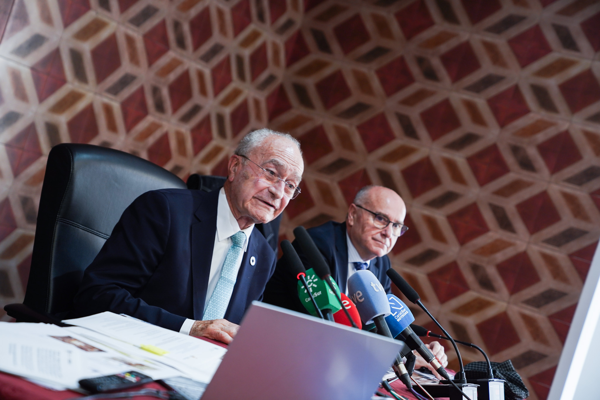 El alcalde de Málaga, Francisco de la Torre, junto a la concejala de Fiestas, Teresa Porras, ha asistido este mediodía a la presentación del estudio ‘Análisis económico de la actividad cofrade de la ciudad de Málaga 2024’, que se ha celebrado en la Casa Hermandad de Fusionadas.