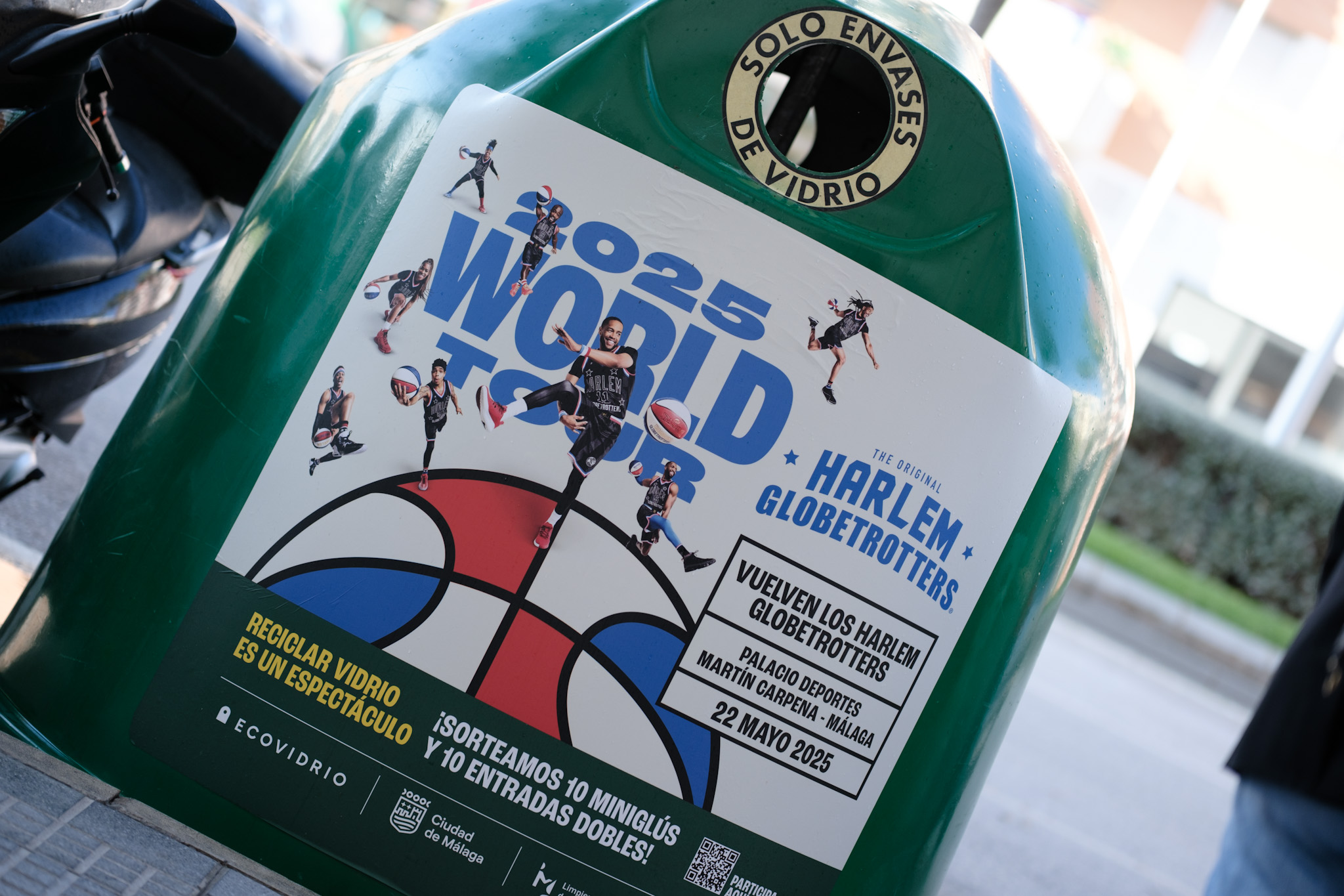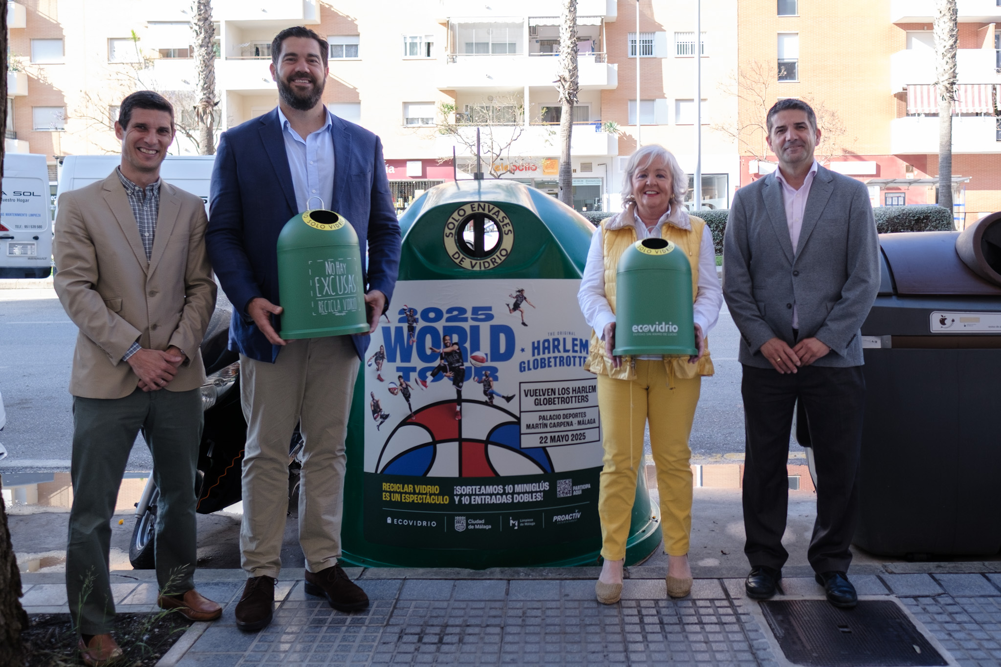 Los concejales delegados de Servicios Operativos, Playas y Fiestas, y de Deporte, Teresa Porras y Borja Vivas, respectivamente, junto con el gerente de zona de Ecovidrio, Jesús Gutiérrez, han asistido a la iniciativa de dicha entidad para impulsar el reciclaje de vidrio con un sorteo de entradas dobles para los Harlem Globetrotters 2025, espectáculo que tendrá lugar en el Palacio de Deportes José María Martín Carpena el próximo 22 de mayo. Esta acción, que cuenta con la colaboración del Ayuntamiento y que se enmarca en la iniciativa Súper Recicladores -una plataforma de Ecovidrio de gamificación y promociones para premiar los hábitos sostenibles- consiste en un sorteo, que estará activo hasta el 13 de mayo, de 10 packs de entradas dobles. Además de las entradas, también se sortearán 10 miniglús serigrafiados con los logotipos de Ecovidrio y Harlem Globetrotters, diseñados especialmente para esta acción.