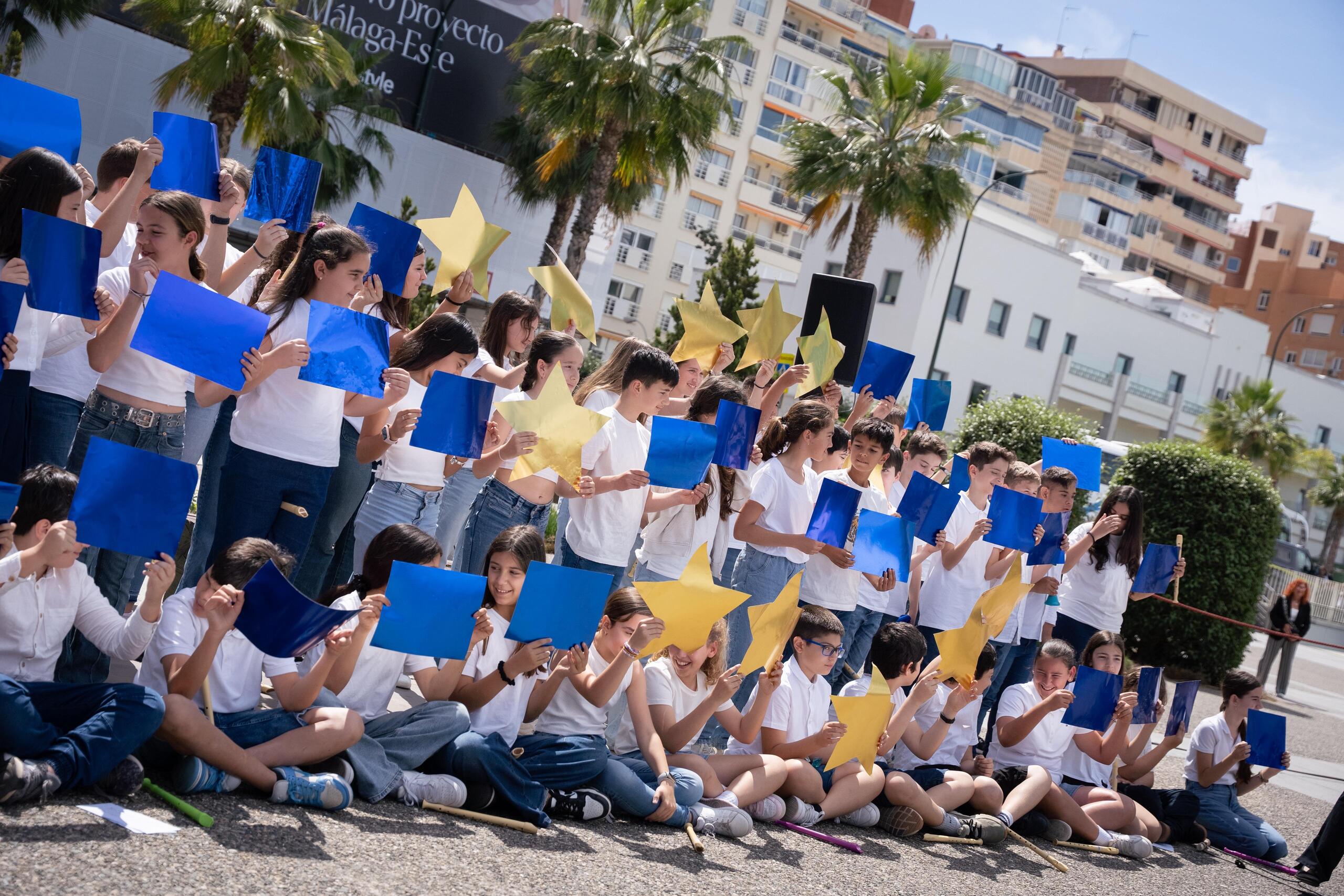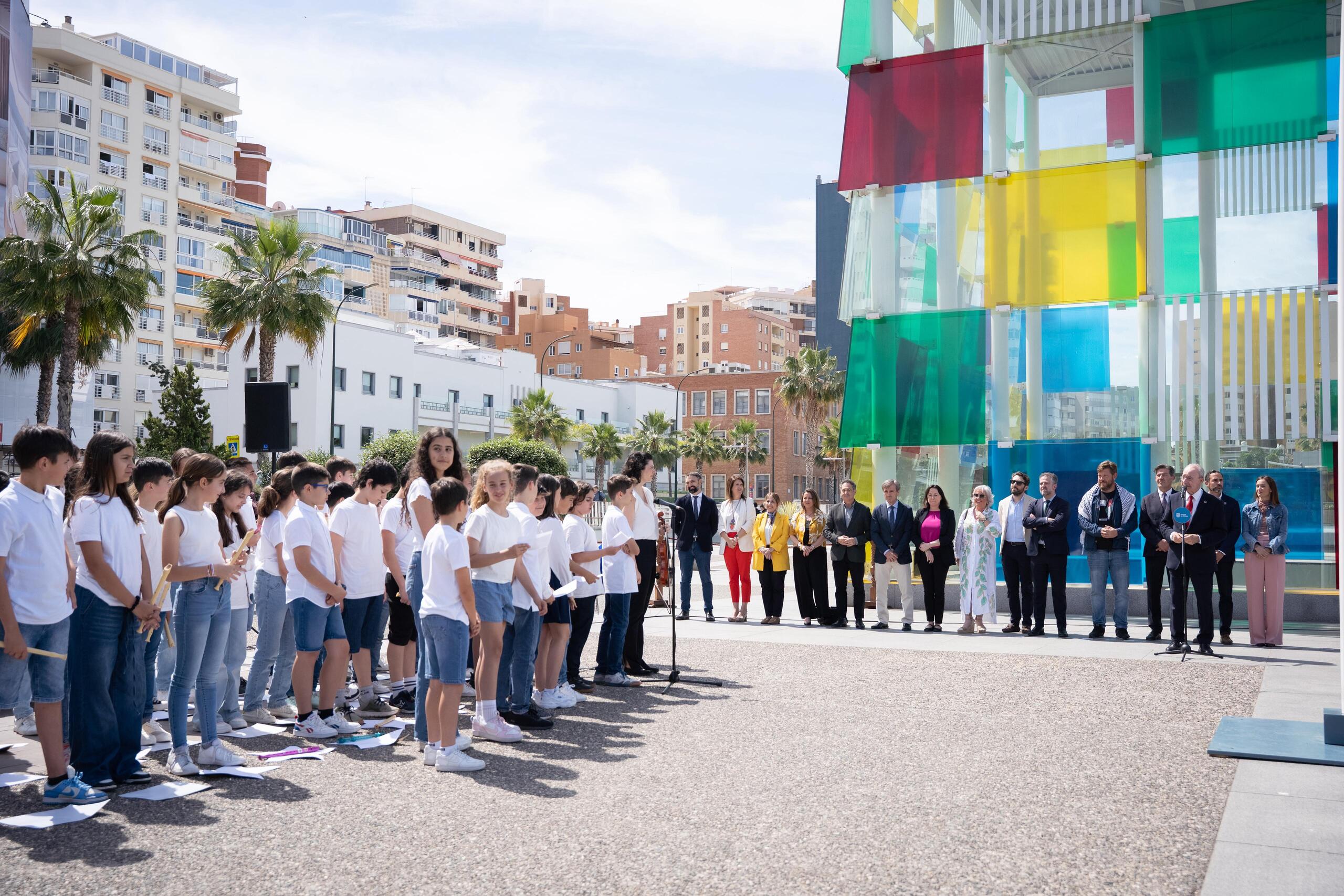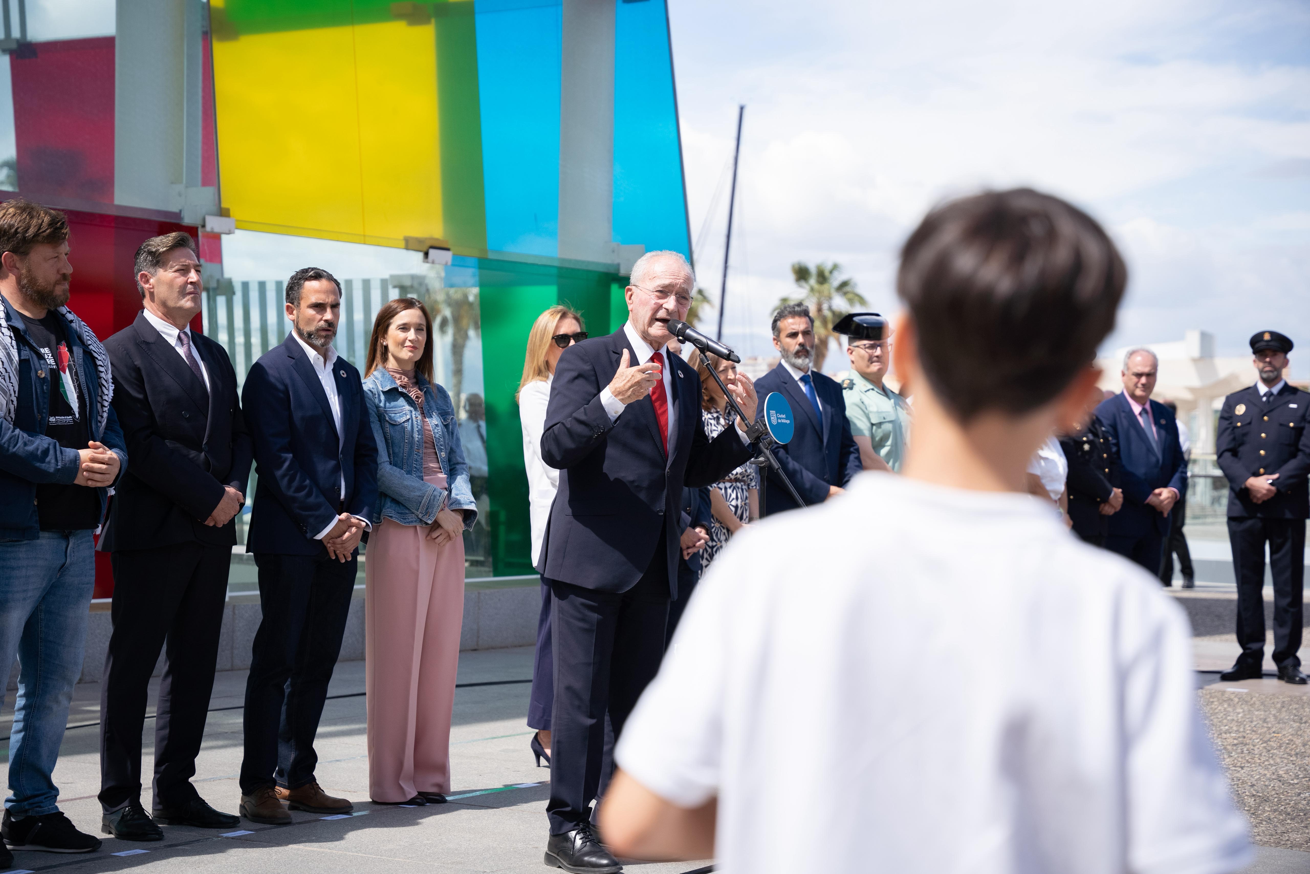 El alcalde de Málaga, Francisco de la Torre, junto a otros ediles de la Corporación Municipal; la delegada del Gobierno de la Junta de Andalucía, Patricia Navarro; el subdelegado del Gobierno, Javier Salas; el diputado de Seguridad y Emergencia de la Diputación de Málaga, Luis José Rodríguez; y la vicedecana del Cuerpo Consular de Málaga, Paloma Almeida; ha participado en el acto institucional celebrado esta mañana con motivo de la celebración del Día de Europa. Un año más, el acto ha tenido lugar en la explana del Centre Pompidou Málaga. Ha contado con la participación de alumnos y alumnas del CEIP Tartessos.