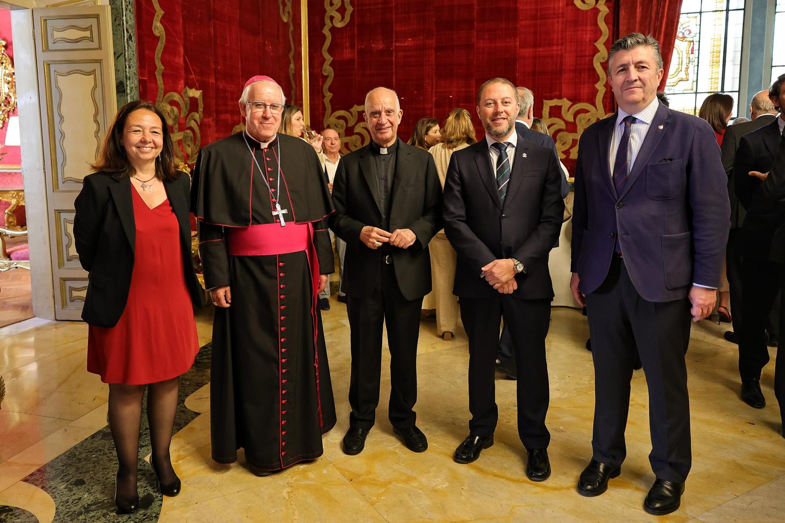 El alcalde de Málaga, Francisco de la Torre, junto a las concejalas delegadas de Cultura y Fiestas, Mariana Pineda y Teresa Porras, y los portavoces municipales del Partido Popular y Vox, Elisa Pérez de Siles y Antonio Alcázar, ha participado en la recepción oficial ofrecida por la embajadora de España ante el Vaticano, Isabel Celaá, en el marco del Jubileo de las Cofradías 2025.
