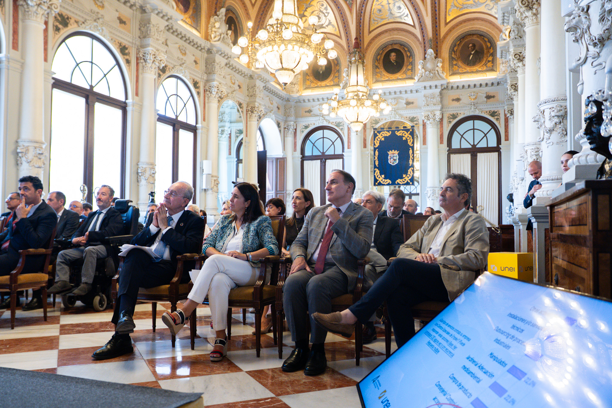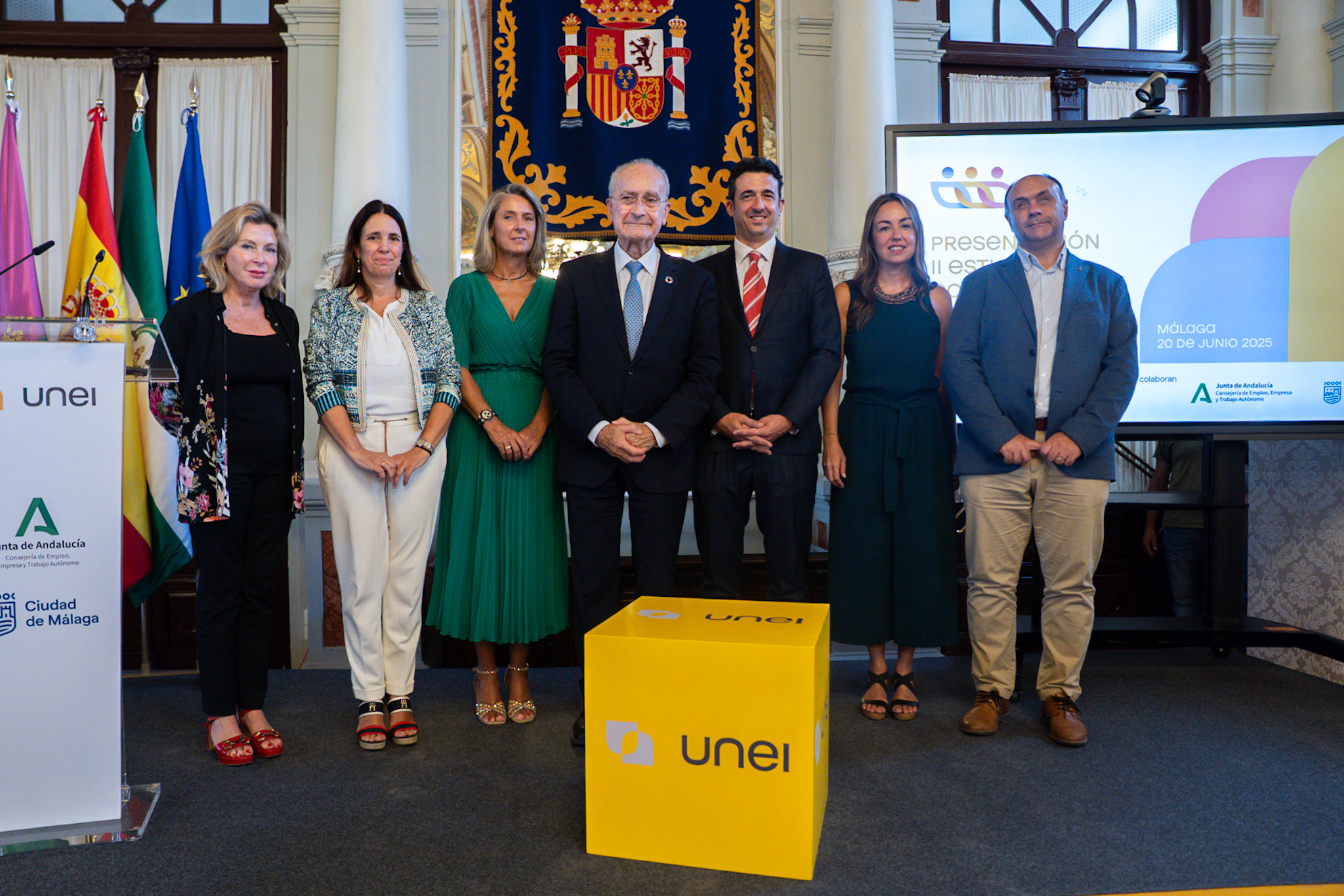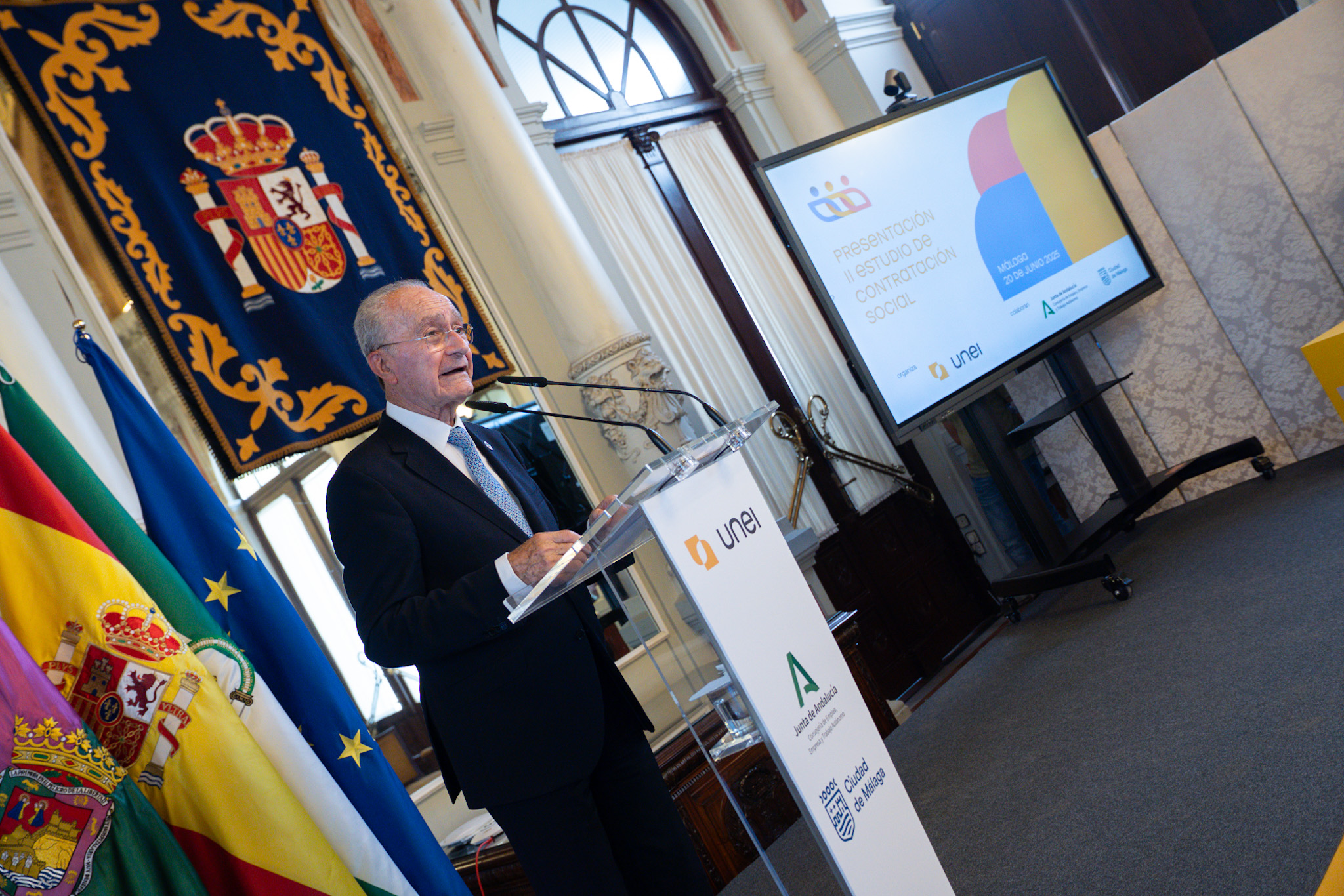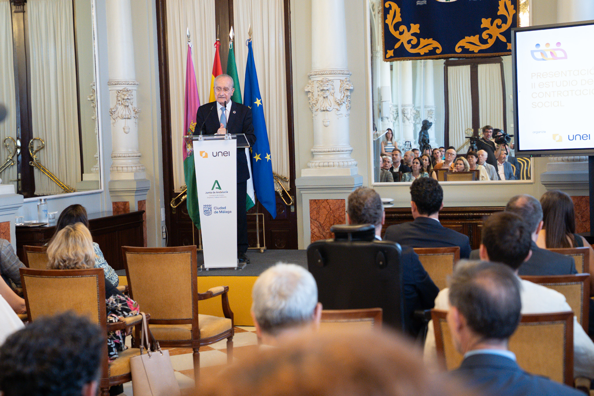 El alcalde de Málaga, Francisco de la Torre, junto al concejal delegado de Derechos Sociales, Francisco Cantos, ha asistido a la presentación del II Estudio de Contratación Social en Andalucía, elaborado por la empresa UNEI con el apoyo de la Consejería de Empleo, Empresa y Trabajo Autónomo de la Junta de Andalucía con datos de un centenar de empresas andaluzas de más de 100 trabajadores, representativas del tejido económicoandaluz. El acto, celebrado en el Salón de los Espejos del Ayuntamiento, también ha contado con la participación de la secretaria general del Servicio Público de Empleo y Formación, Victoria Martín Lomeña; el director general de UNEI, Rafael Cía; y la directora de Estrategia y Marketing de la compañía, InmaPonce. A través de este estudio se desprende que más del 60% de las empresas andaluzas está desarrollando estrategias de diverso alcance para planificar la inclusión laboral de personas con discapacidad más allá de los porcentajes fijados por la ley, bien sea de forma directa o a través de la contratación social.