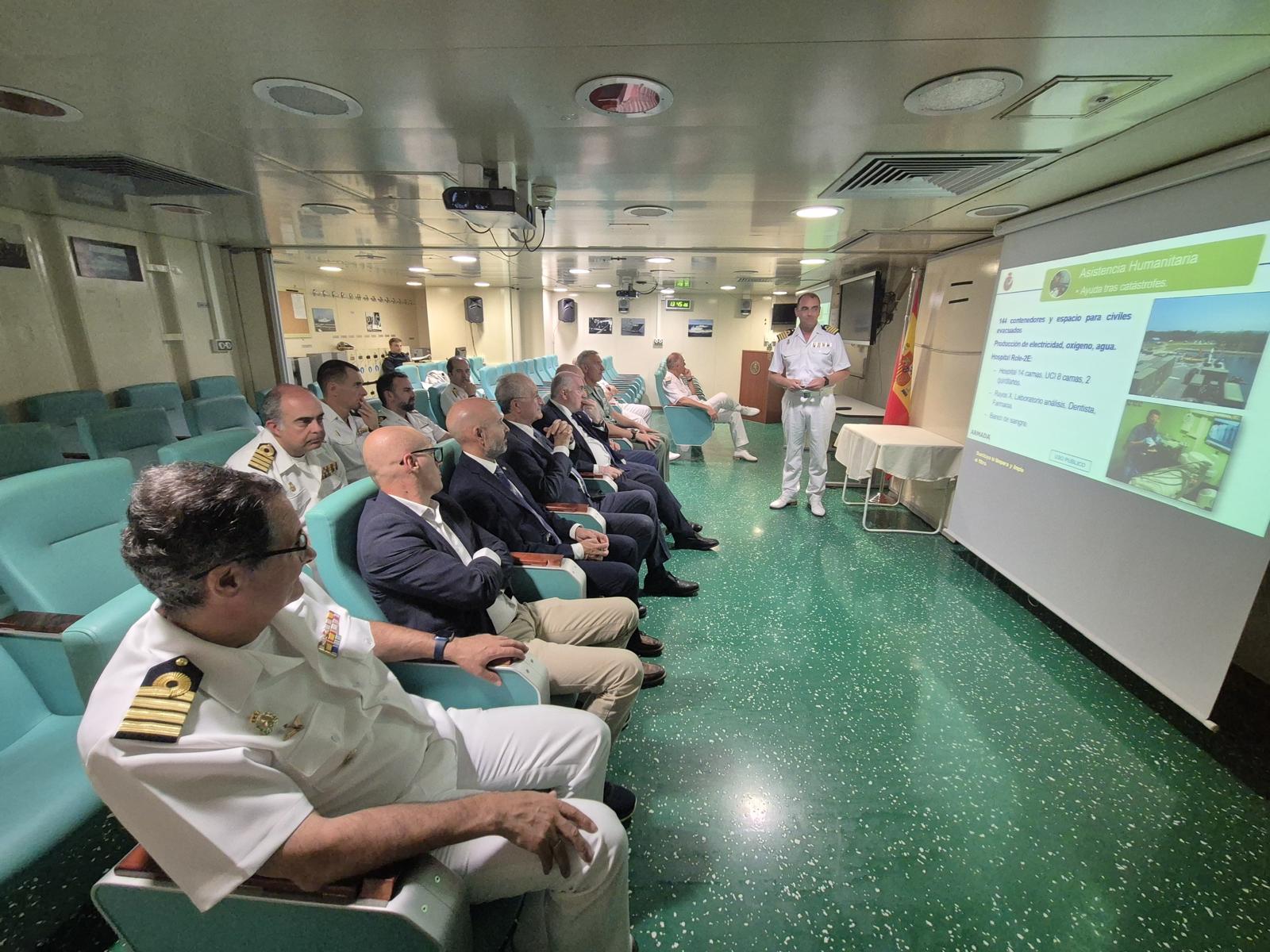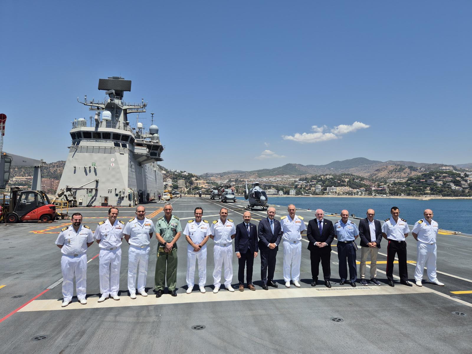 El alcalde de Málaga, Francisco de la Torre, ha asistido esta mañana a la recepción a bordo del buque “Juan Carlos I” de la Armada, por parte del comandante del Grupo Anfibio y de Proyección de la Flota, el contraalmirante Antonio González-Tánago de la Lastra, junto con el comandante del “Juan Carlos I”, el capitán de navío Santiago Martínez Mata. En este acto, previo a la exhibición del desembarco anfibio que tendrá lugar mañana 8 de julio en Málaga, también han estado presentes el subdelegado del Gobierno en Málaga, Javier Salas, el delegado territorial de Sostenibilidad y Medio Ambiente de la Junta de Andalucía, José Antonio Víquez, y el vicepresidente 2º de la Diputación de Málaga, Manuel Marmolejo, entre otros. Durante la visita, realizaron un recorrido por las instalaciones del barco, así como recibieron información de las capacidades del “Juan Carlos I” y del despliegue “Dédalo”.