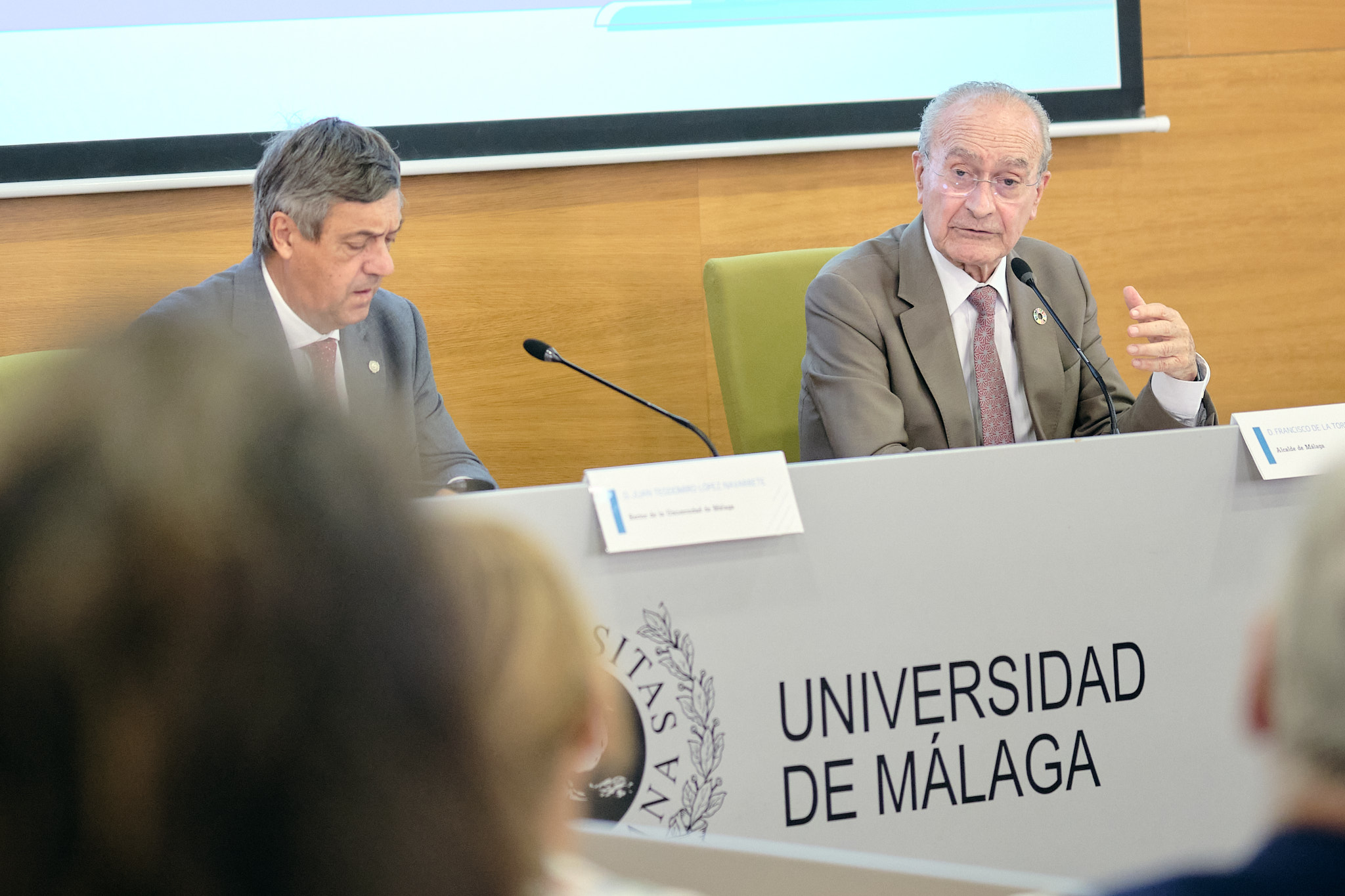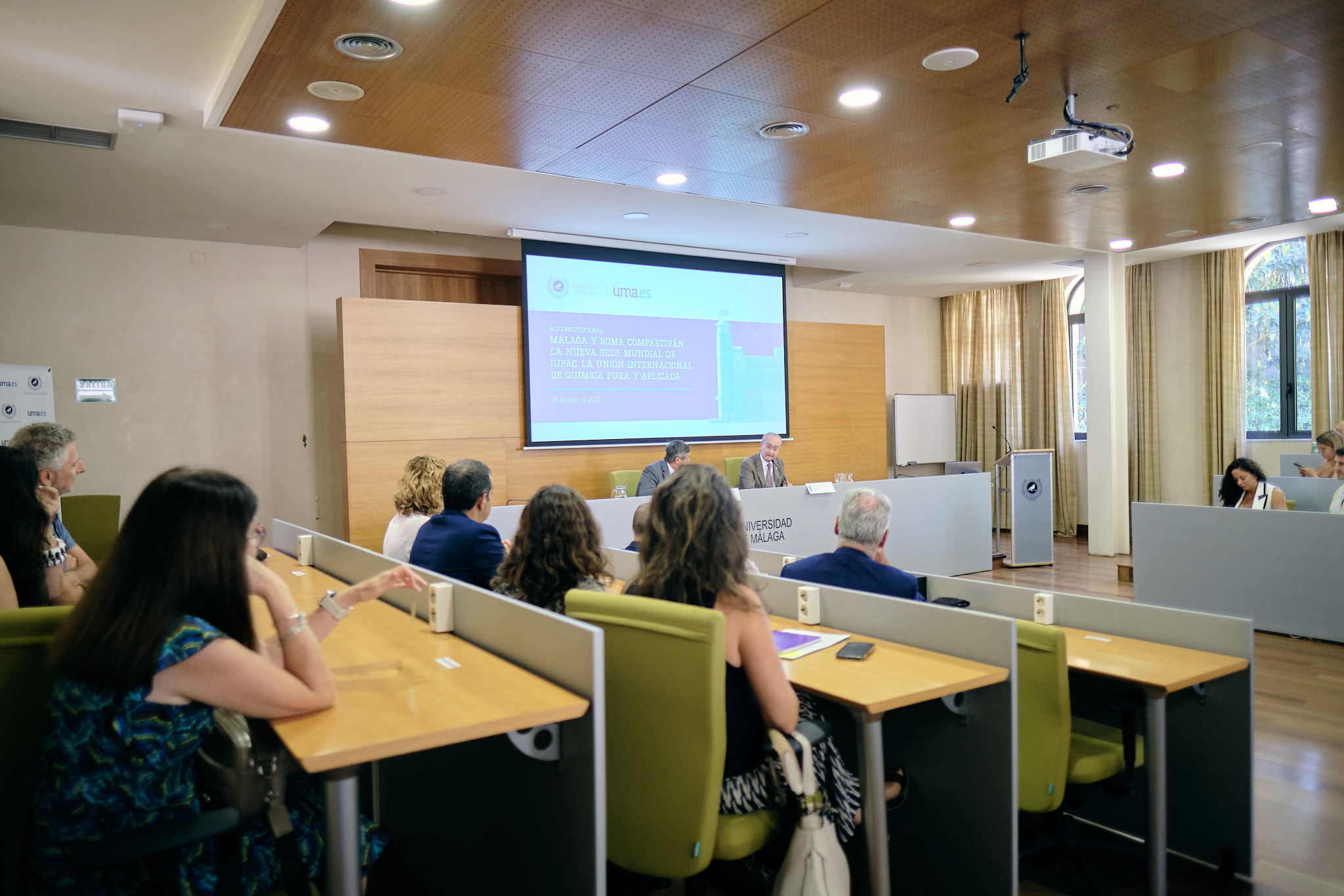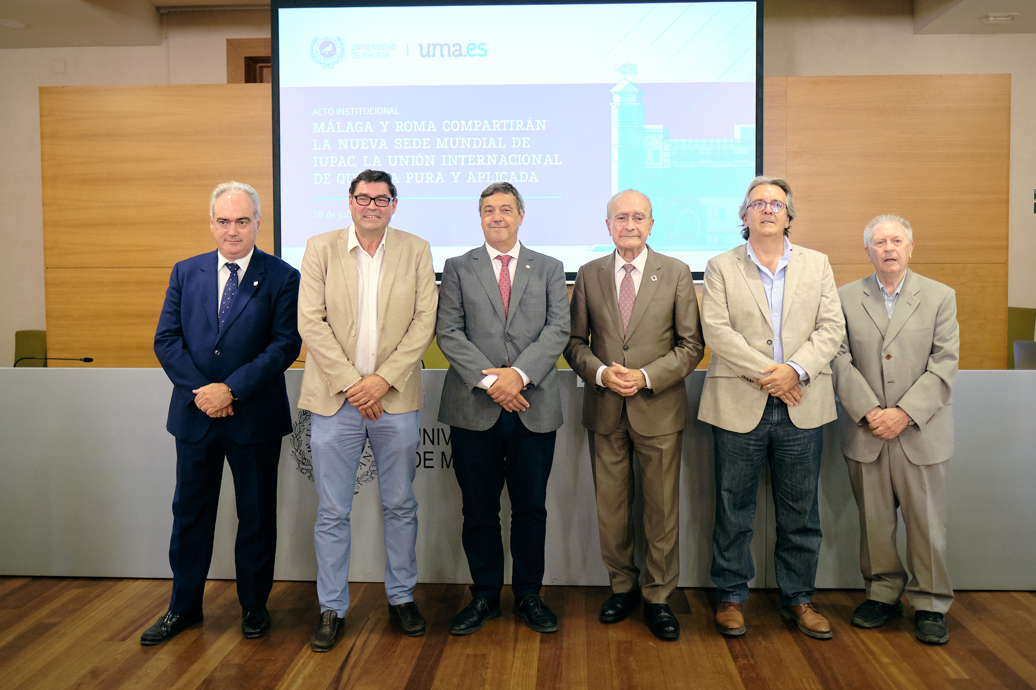 El alcalde de Málaga, Francisco de la Torre, junto al rector de la Universidad de Málaga, Teodomiro López, ha participado esta mañana en el acto de presentación de la Unión Internacional de Química Pura y Aplicada (IUPAC), que se ha celebrado en el Rectorado de la UMA. Este organismo, que establece los estándares en nomenclatura química, terminología científica y métodos de medición, ha trasladado su sede administrativa desde Research Triangle Park (Carolina del Norte, EE.UU.) a un modelo de doble sede en Málaga (España) y Roma (Italia), tras un proceso de selección del que han resultado elegidas ambas ciudades.