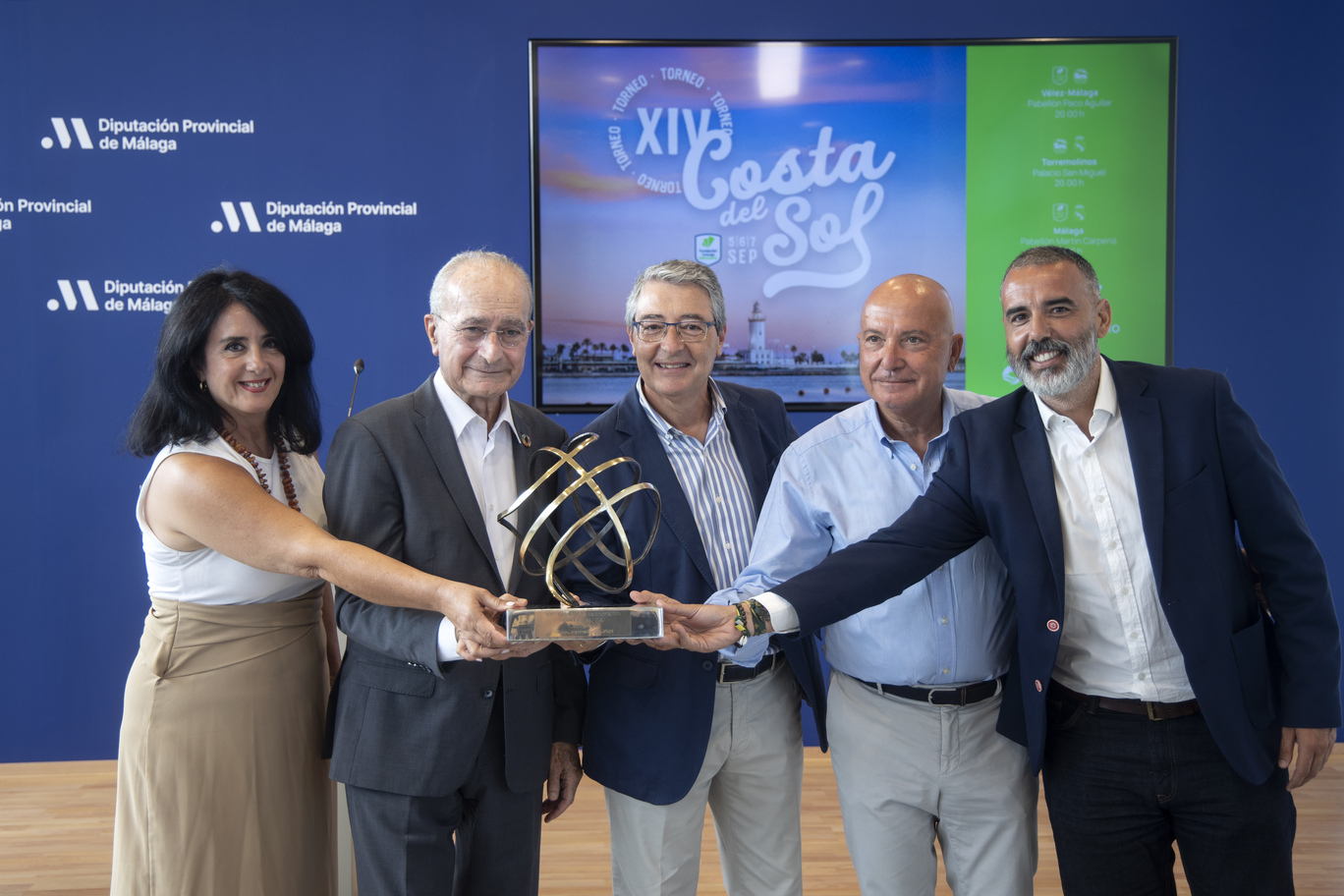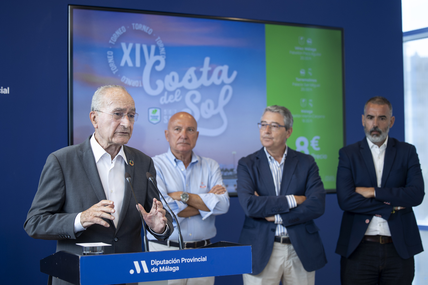El alcalde de Málaga, Francisco de la Torre, acompañado por el concejal delegado de Deporte, Borja Vivas, ha participado esta mañana a la presentación del XIV Torneo Costa del Sol de baloncesto que se celebrará del 5 al 7 de septiembre y que enfrentará a los equipos de Unicaja, Real Madrid y Alba Berlín en Vélez-Málaga, Torremolinos y en el Palacio de Deportes José María Martín Carpena de Málaga. En el acto, que ha tenido lugar en la Diputación Provincial de Málaga, también han participado el presidente de la Diputación, Francisco Salado, y el presidente de Unicaja Baloncesto, Antonio Jesús López Nieto, así como Luis Rodríguez y Alicia Ramírez, concejales de los ayuntamientos de Torremolinos y Vélez-Málaga, respectivamente.