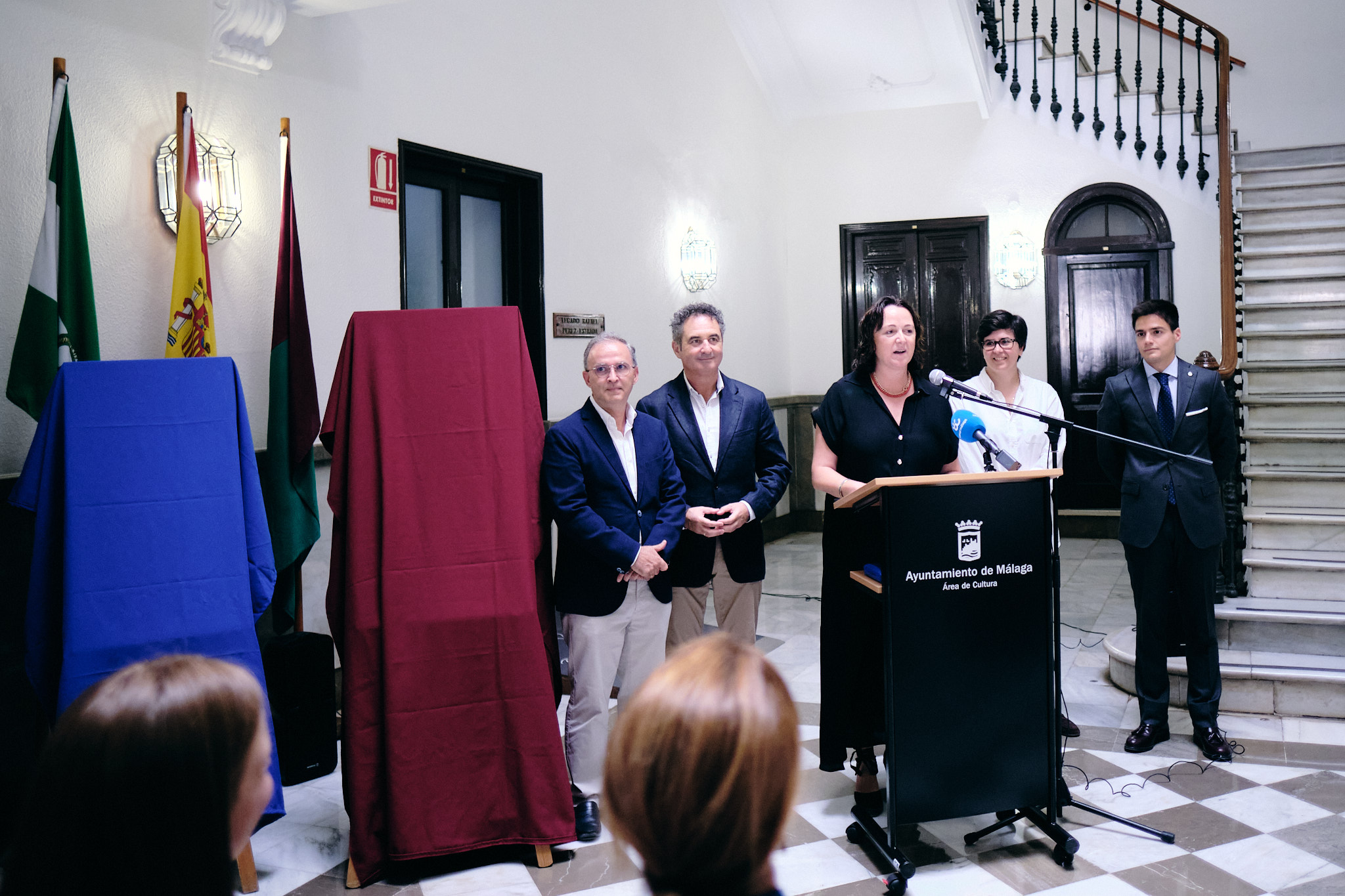 Los concejales delegados de Cultura y del distrito Centro, Mariana Pineda y Francisco Cantos, respectivamente, junto al hermando mayor de la Real Hermandad de Santa María de la Victoria, Miguel Orellana, han asistido a la presentación del cartel de la procesión de Santa María de la Victoria de este año, obra de Estefanía Recio, que ha tenido lugar en el Archivo Municipal.