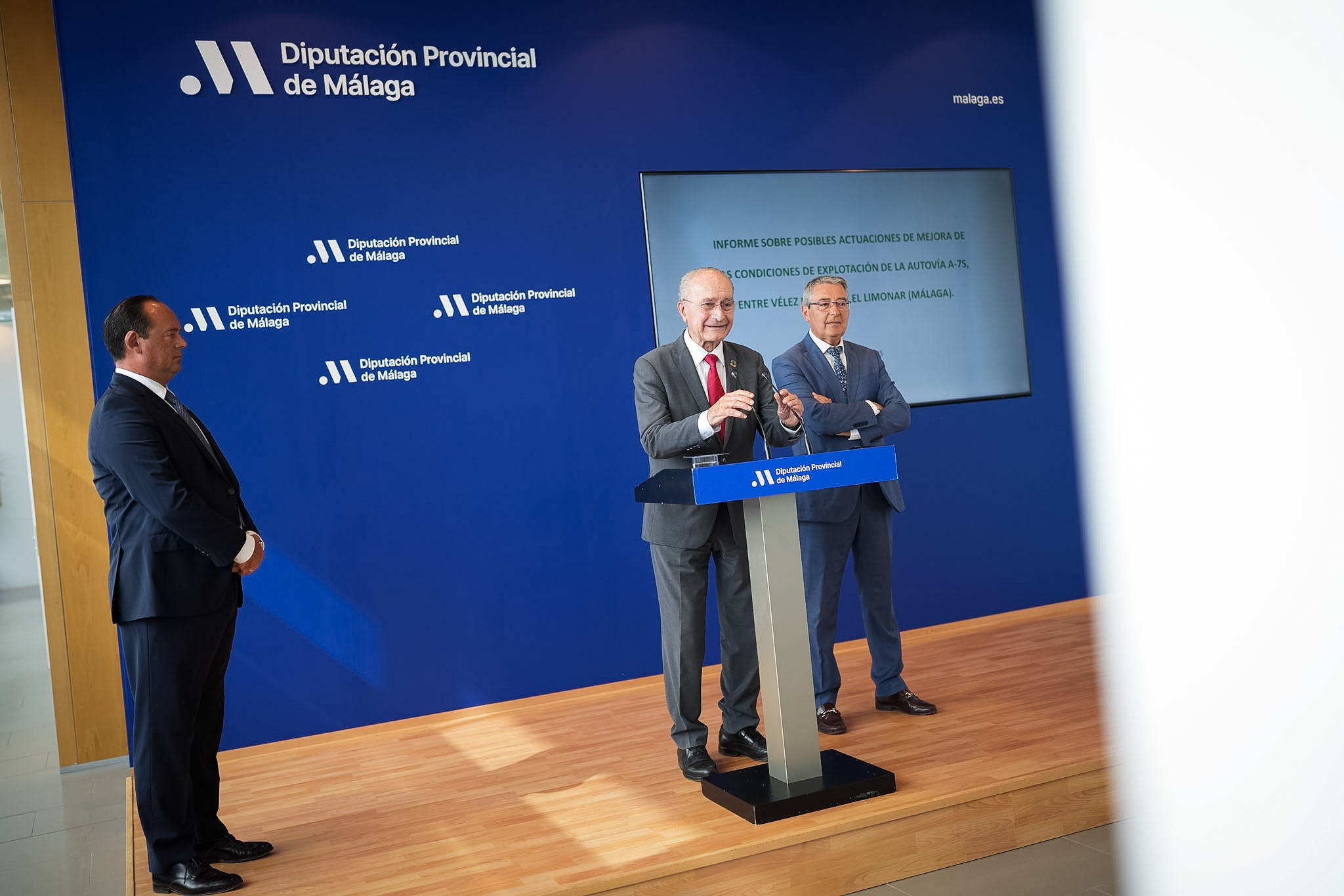 El alcalde de Málaga, Francisco de la Torre, y el presidente de la Diputación de Málaga y alcalde de Rincón de la Victoria, Francisco Salado, junto al ingeniero y CEO fundador de AMEI, Carlos Atienza, han presentado hoy el estudio que plantea alternativas a corto plazo para descongestionar el tráfico en la A-7 actuando en siete enlaces en Málaga Este y Rincón de la Victoria. El informe técnico, realizado por la consultora Andaluza de Modelado e Ingeniería (AMEI) y solicitado por ambos ayuntamientos a la Fundación Madeca de la Diputación, propone la ejecución de diversas alternativas que podrían ejecutarse a corto plazo para descongestionar la A-7 en el tramo entre Málaga-Este (Limonar) y Rincón de la Victoria hasta el término municipal de Vélez-Málaga. En concreto, este estudio plantea actuar en siete enlaces de entrada y salida a la autovía con soluciones como rediseñar y realizar nuevas estructuras en los ramales de acceso a la A-7, duplicar los carriles de salida y en algunos casos construir glorietas para ordenar mejor el tránsito de vehículos; y cuantifica esas actuaciones en algo más de 14 millones de euros (sin IVA).