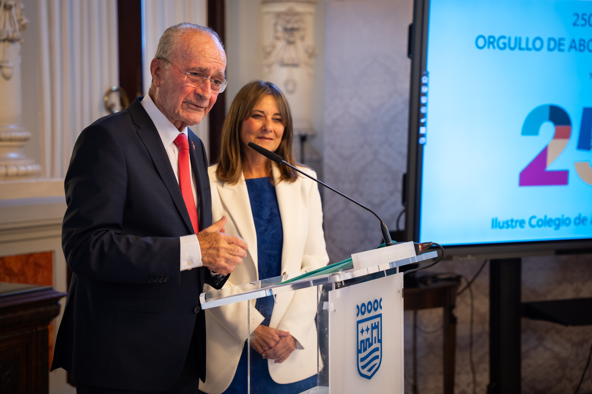 El alcalde Málaga, Francisco de la Torre, junto a la decana del Colegio de Abogados, Flor Carrasco, ha asistido a la presentación de los actos organizados con motivos del 250 aniversario del Ilustre Colegio de Abogados de Málaga. En el acto ha estado presente el concejal delegado de Seguridad, Avelino Barrionuevo, además de integrantes de la Junta Directiva del colegio profesional. Durante la presentación, que ha tenido lugar en el Salón de los Espejos, se ha dado a conocer el cartel oficial de los actos que se desarrollarán durante 2026.