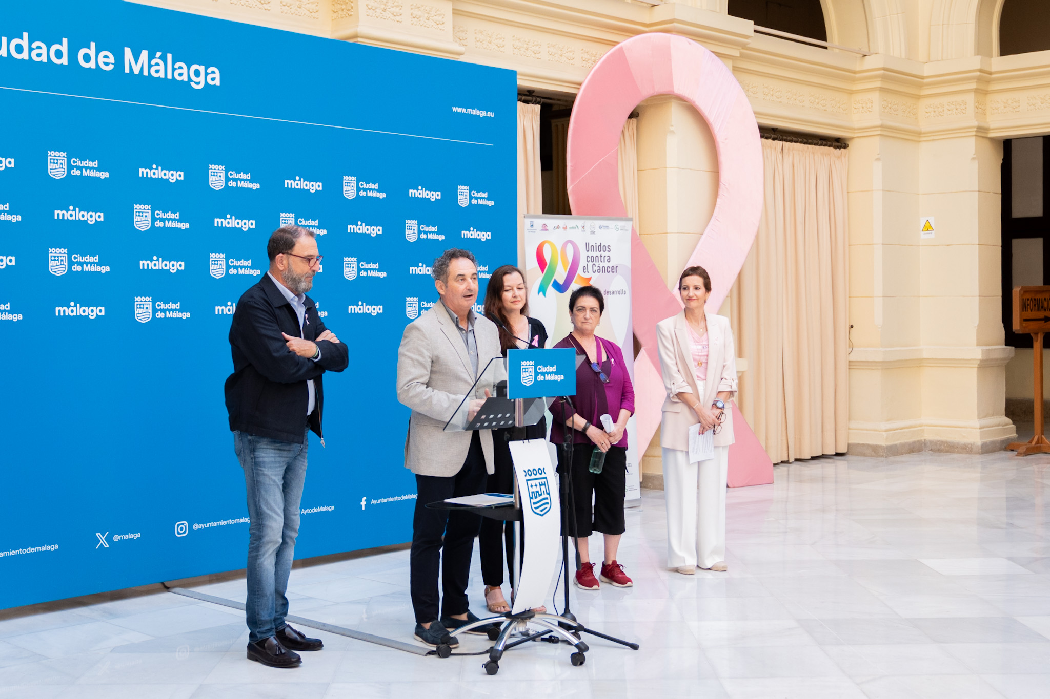 El concejal delegado del Área de Derechos Sociales, Francisco Cantos, ha asistido hoy a la lectura del manifiesto con motivo del Día Internacional de la lucha contra el Cáncer de Mama, que se conmemora cada 19 de octubre. El acto ha sido organizado por la Agrupación de Desarrollo Unidos Contra el Cáncer , de la que forma parte el Ayuntamiento a través del Área de Derechos Sociales junto a las entidades ASAMMA, Fundación Ronald McDonald, AVOI, FMAEC, CUDECA, AECC, Cesare Scariolo y Fundación AndrésOlivares. El acto, que se ha celebrado en el Patio de Banderas del Ayuntamiento, también ha contado con la presencia del delegado territorial de la Consejería de Salud, Carlos Bautista; la diputada provincial de Servicios Sociales, María Dolores Vergara; y la presidenta de ASAMMA, Carmen Doncel, mientras el manifiesto ha sido leído por dos socias de esta entidad, Francisca Muñoz y Rosa Hormigo. En el marco de este día, la fachada del Ayuntamiento se iluminará en rosa la noche del domingo, 19 de octubre.