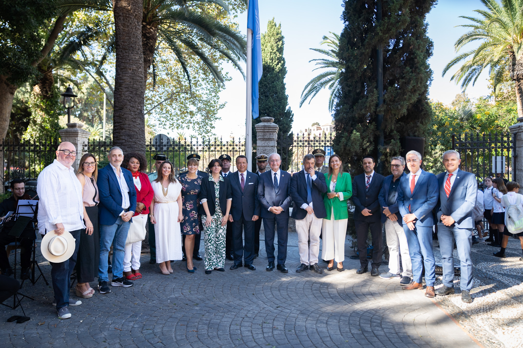 El alcalde de Málaga, Francisco de la Torre, junto a la concejala delegada de Acción Exterior, Mar Torres, y otros miembros de la Corporación Municipal, ha presidido hoy el acto institucional de izado de la bandera de la ONU con motivo de la conmemoración del 80.º aniversario de la entrada en vigor de la Carta de Naciones Unidas. La ceremonia ha tenido lugar en la Casa de las Naciones Unidas de Málaga, situada en el antiguo Hospital Noble. Con motivo de esta fecha, la fachada del Ayuntamiento se iluminará esta noche de color azul.