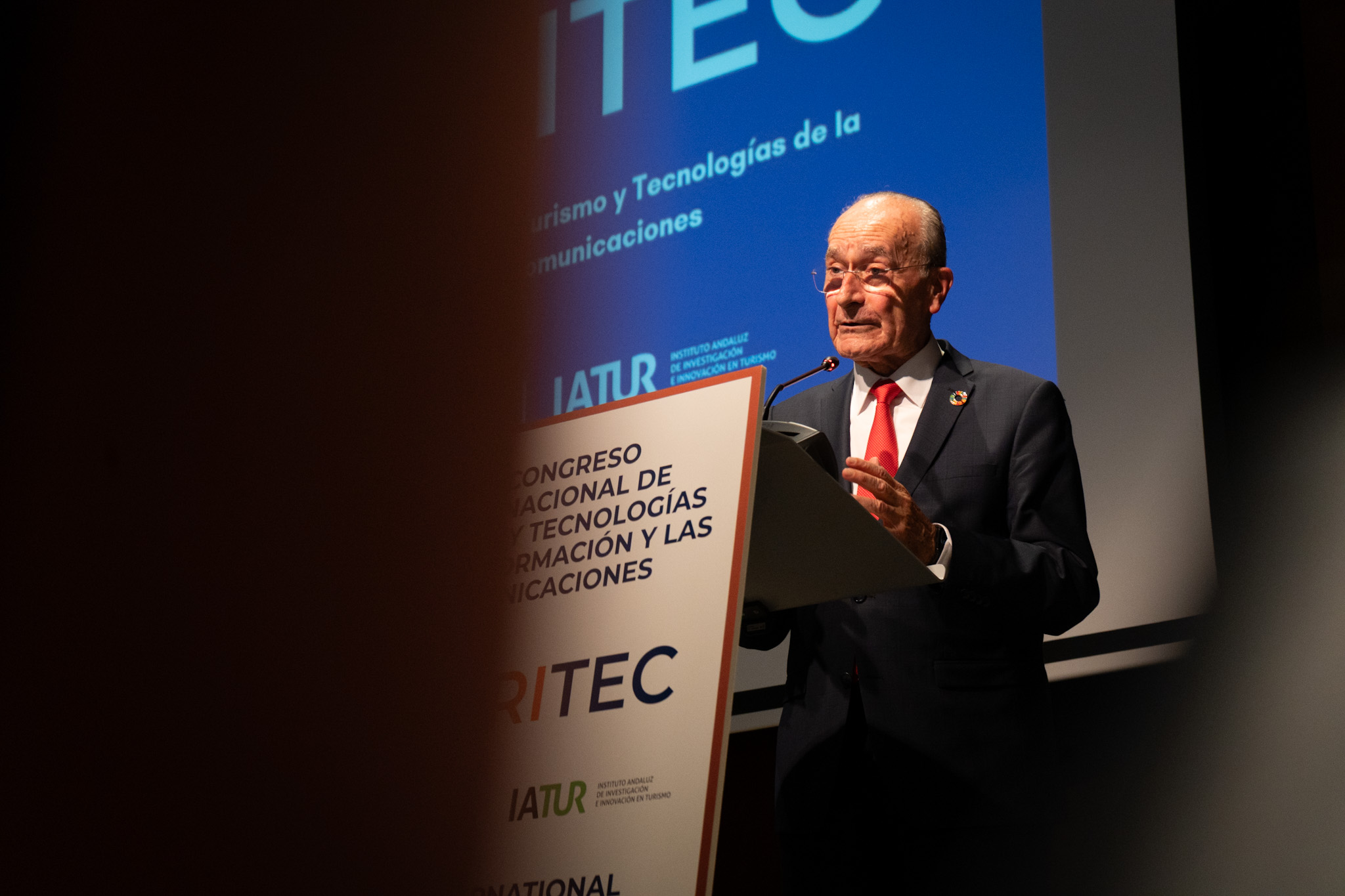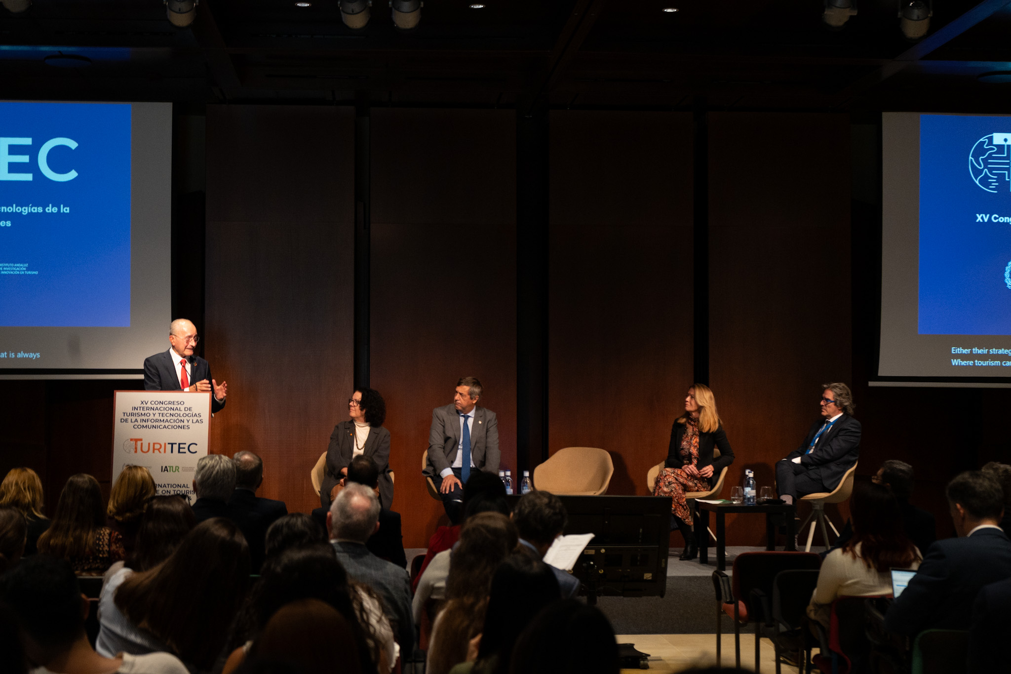 El alcalde de Málaga, Francisco de la Torre, junto al rector de la Universidad de Málaga, Teodomiro López; al director del Instituto Andaluz de Investigación e Innovación en Turismo, Enrique Navarro; a la directora general de Ordenación Turística de la Consejería de Turismo y Andalucía Exterior, Elena Baena; y a la directora de Investigación, Desarrollo e Innovación Turística de SEGITTUR, María Velasco González, ha participado esta mañana en la inauguración del XV Congreso Internacional de Turismo y Tecnologías de la Información y las Comunicaciones TURITEC 2025, que se celebra hasta mañana viernes, 7 de noviembre, enFycma.