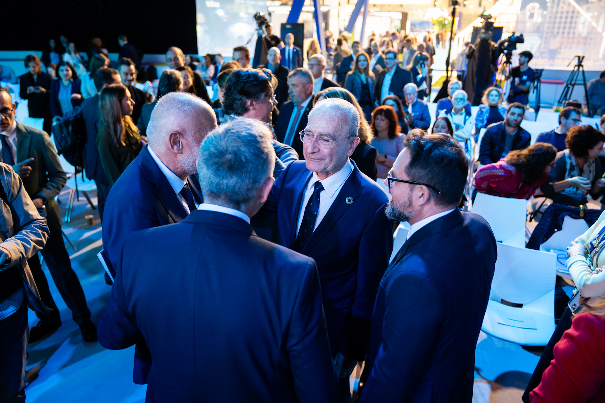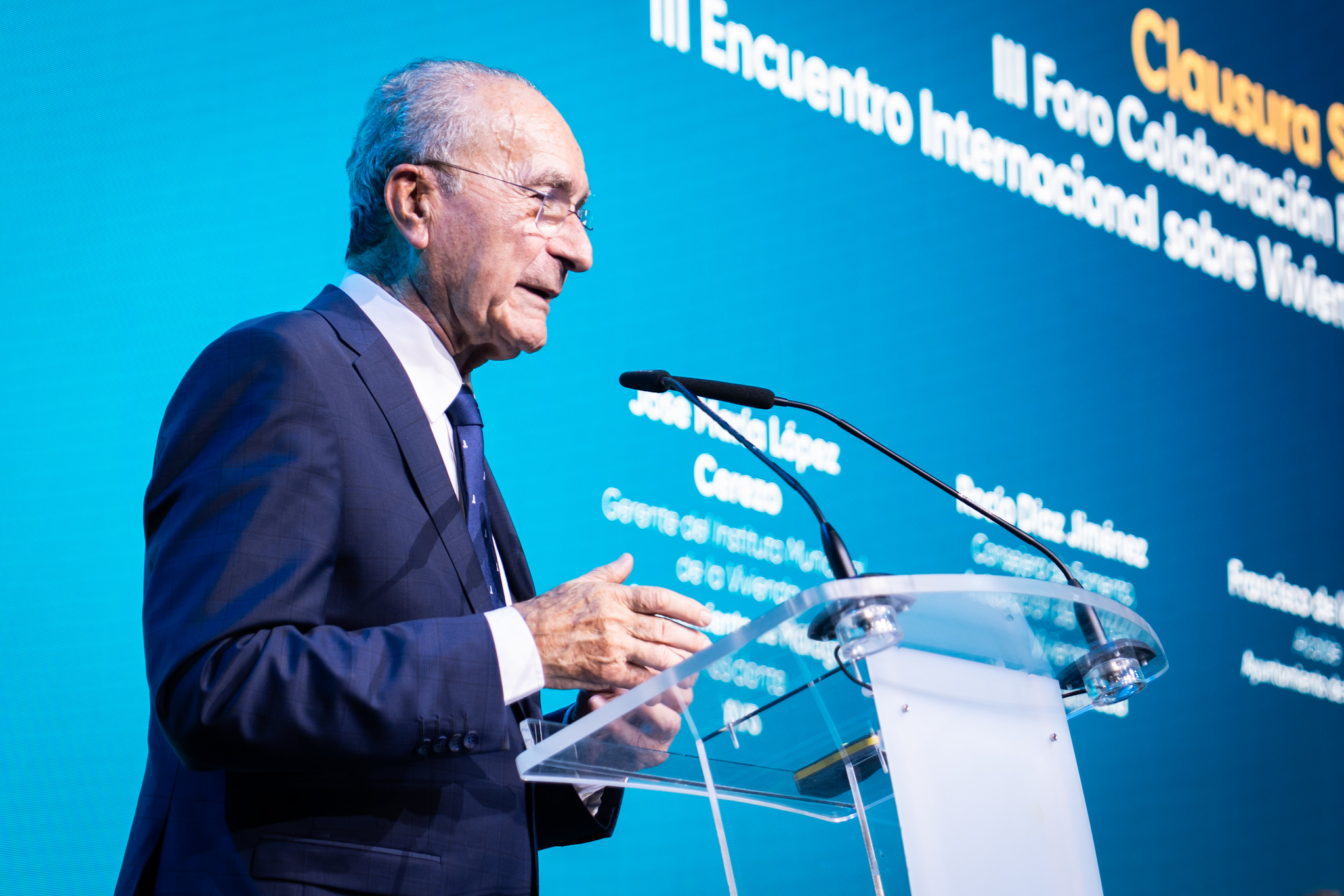 El alcalde de Málaga, Francisco de la Torre, junto a la consejera de Fomento, Articulación del Territorio y Vivienda de la Junta de Andalucía, Rocío Díaz; el presidente de Fadeco Promotores, Ignacio Peinado; el presidente de la Asociación de Gestores Públicos de Vivienda y Suelo (AVS) y gerente del Instituto Municipal de la Vivienda, José María López Cerezo, y el presidente de Housing Europe, Marco Corradi, ha participado en la clausura del III Encuentro Internacional sobre Vivienda Protegida, Social y Asequible y del III Foro de Colaboración Público-Privada para la inversión, que se han desarrollado en FYCMA en el marco de Simed 2025.