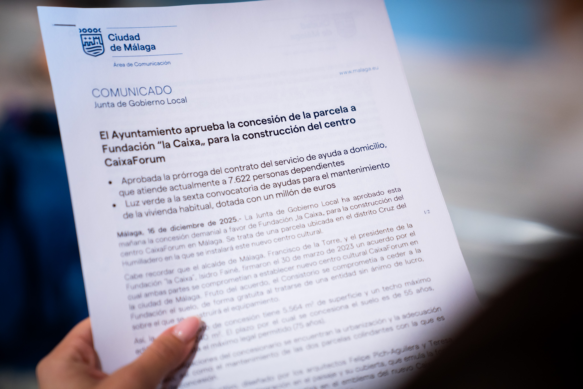 El Ayuntamiento aprueba la concesión de la parcela a Fundación “la Caixa” para la construcción del centro CaixaForum 16/12/2025 Imagen Aprobada la prórroga del contrato del servicio de ayuda a domicilio, que atiende actualmente a 7.622 personas dependientes Luz verde a la sexta convocatoria de ayudas para el mantenimiento de la vivienda habitual, dotada con un millón de euros Documentos COMUNICADO.pdf 334,72 KB kb Galería de imágenes