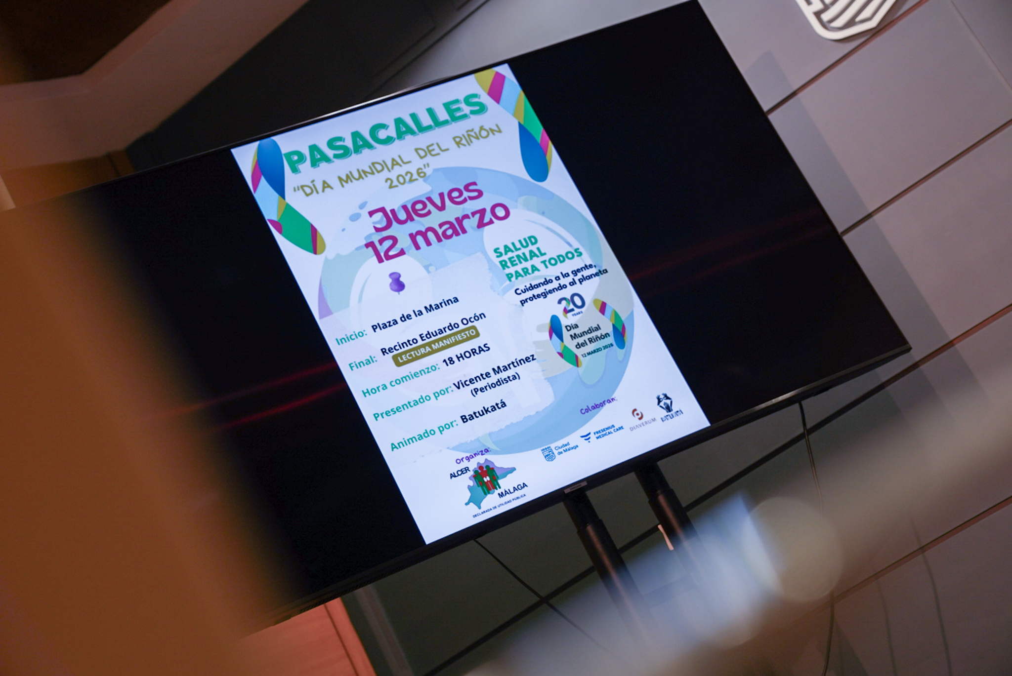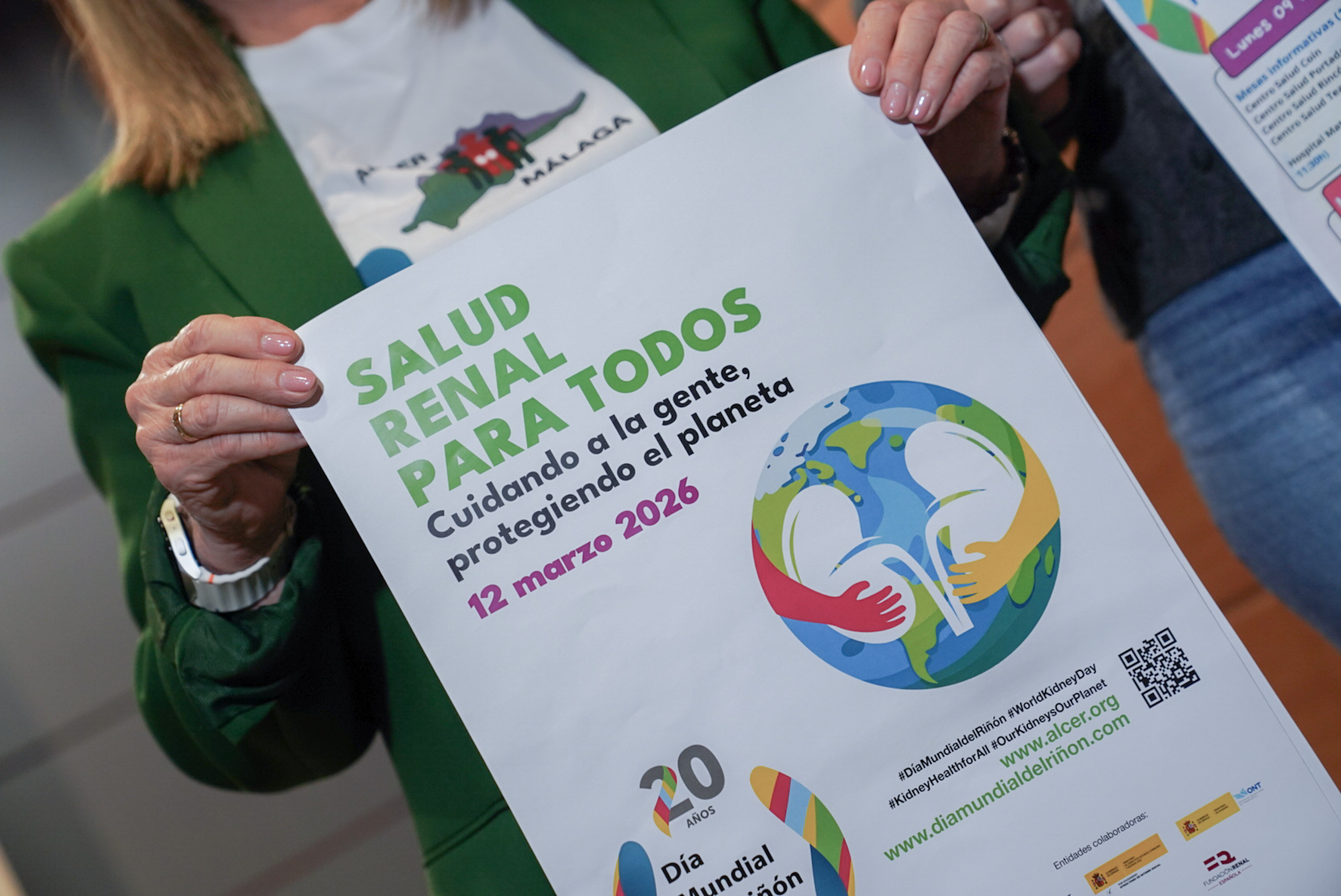 El concejal delegado de Derechos Sociales, Francisco Cantos, junto a la presidenta de Alcer Málaga, Josefa Gómez, ha asistido hoy a la presentación de las actividades organizadas por la asociación durante toda esta semana con motivo del Día Mundial del Riñón, que se conmemora el próximo 12 de marzo. Bajo el lema ‘Salud renal para todos: cuidando a la gente, protegiendo el planeta’, se incidirá en la prevención y la detección precoz mediante mesas informativas en distintos puntos y el jueves 12 se celebrará un pasacalles a partir de las 18:00 horas desde la plaza de la Marina hasta el recinto Eduardo Ocón, que concluirá con la lectura de un manifiesto. Con motivo de esta efeméride, la fachada del Ayuntamiento de Málaga se iluminará ese día de color verde.