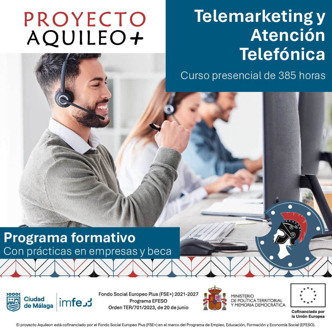 Este itinerario pertenece al Proyecto Aquileo+ del IMFE, cofinanciado por el Fondo Social Europeo Plus (FSE+) en el marco del Programa EFESO. Incluye formación específica, transversal y complementaria, así como prácticas en empresas y tutorías/orientación. El alumnado que complete el itinerario formativo, conforme a las condiciones del proyecto, podrá solicitar una ayuda económica (beca). La asistencia es obligatoria y no se podrá faltar sin justificar.