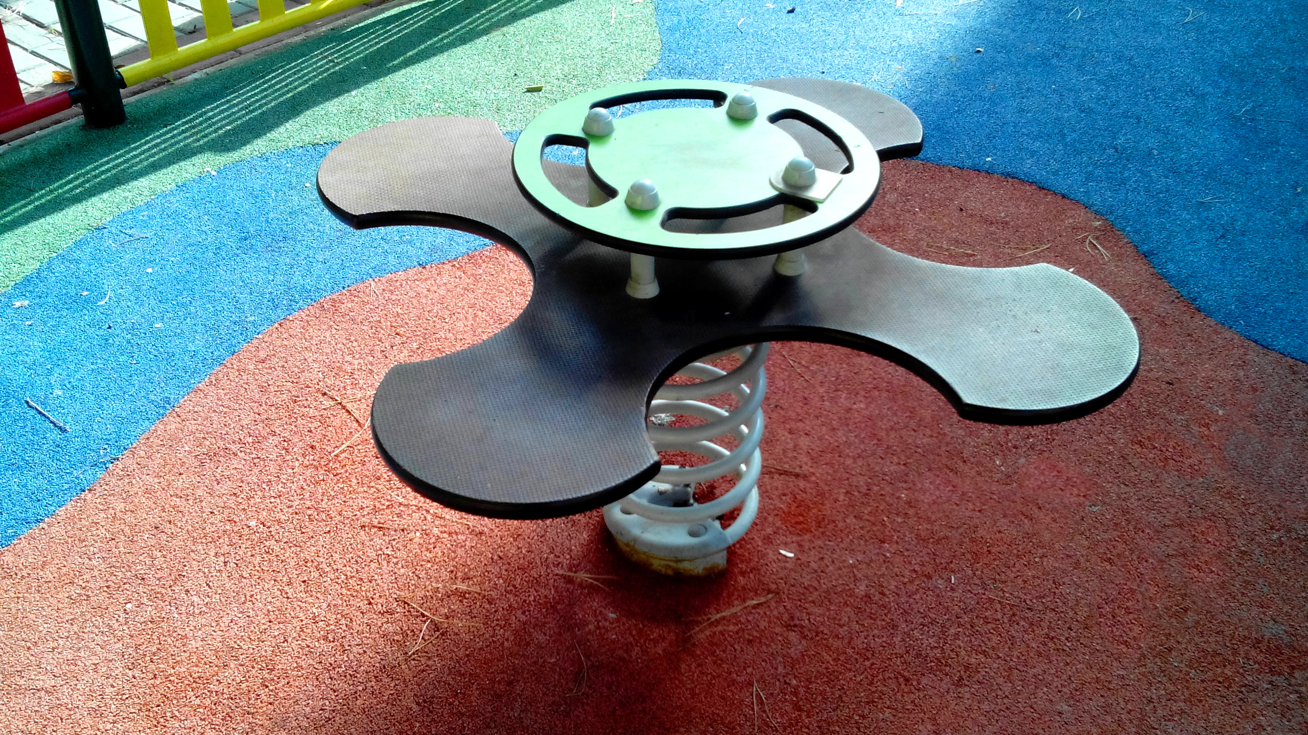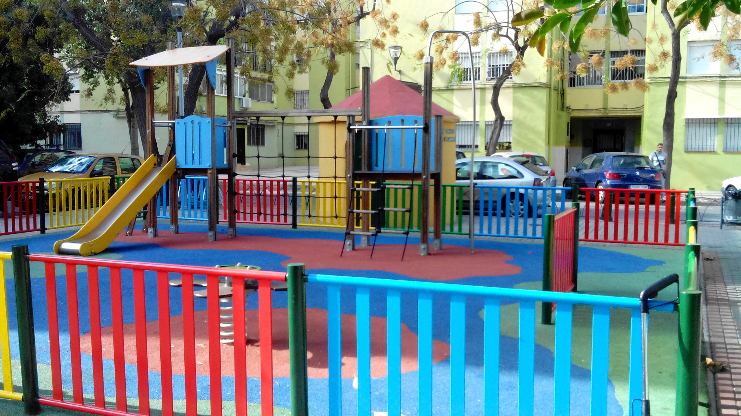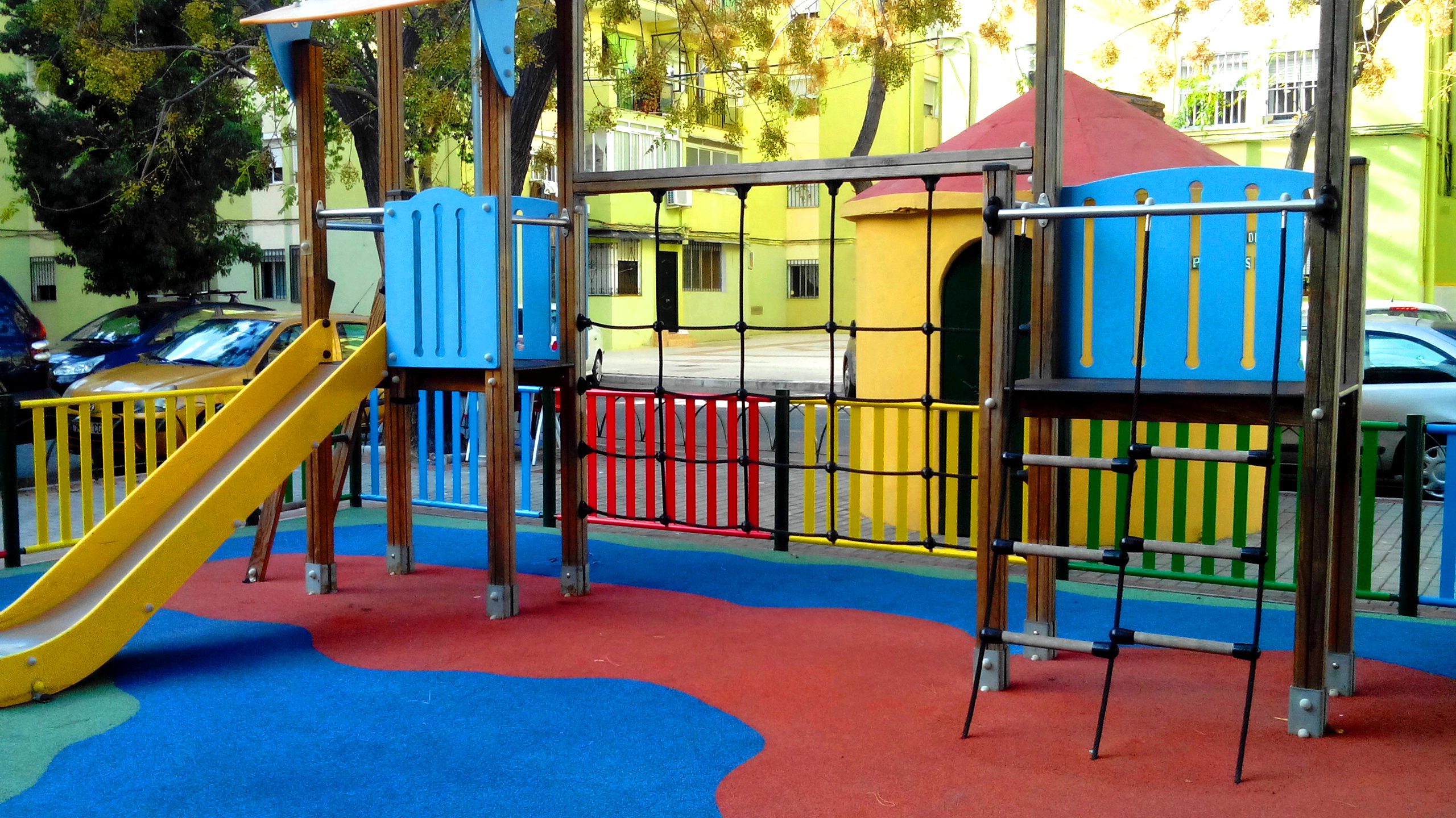 Espacio reservado para el uso y disfrute infantil. Tiene capacidad para múltiples usuarios debido a que cuenta con una zona con varios elementos de juego de pequeño y gran tamaño a fin de que los niños puedan divertirse, tanto de manera individual como con otros niños. Está provisto de suelo de loseta de caucho continua, que asegura la protección de los más pequeños. En total, los elementos de juego que dispone son: - 1 Muelle simple - 1 Aspa - 1 Multijuegos