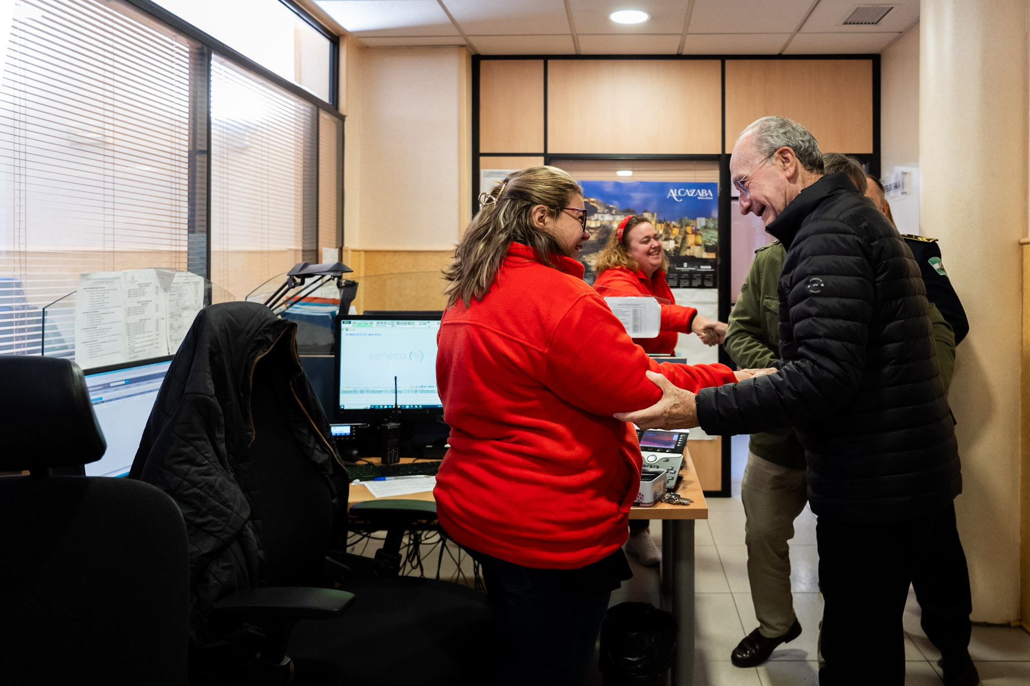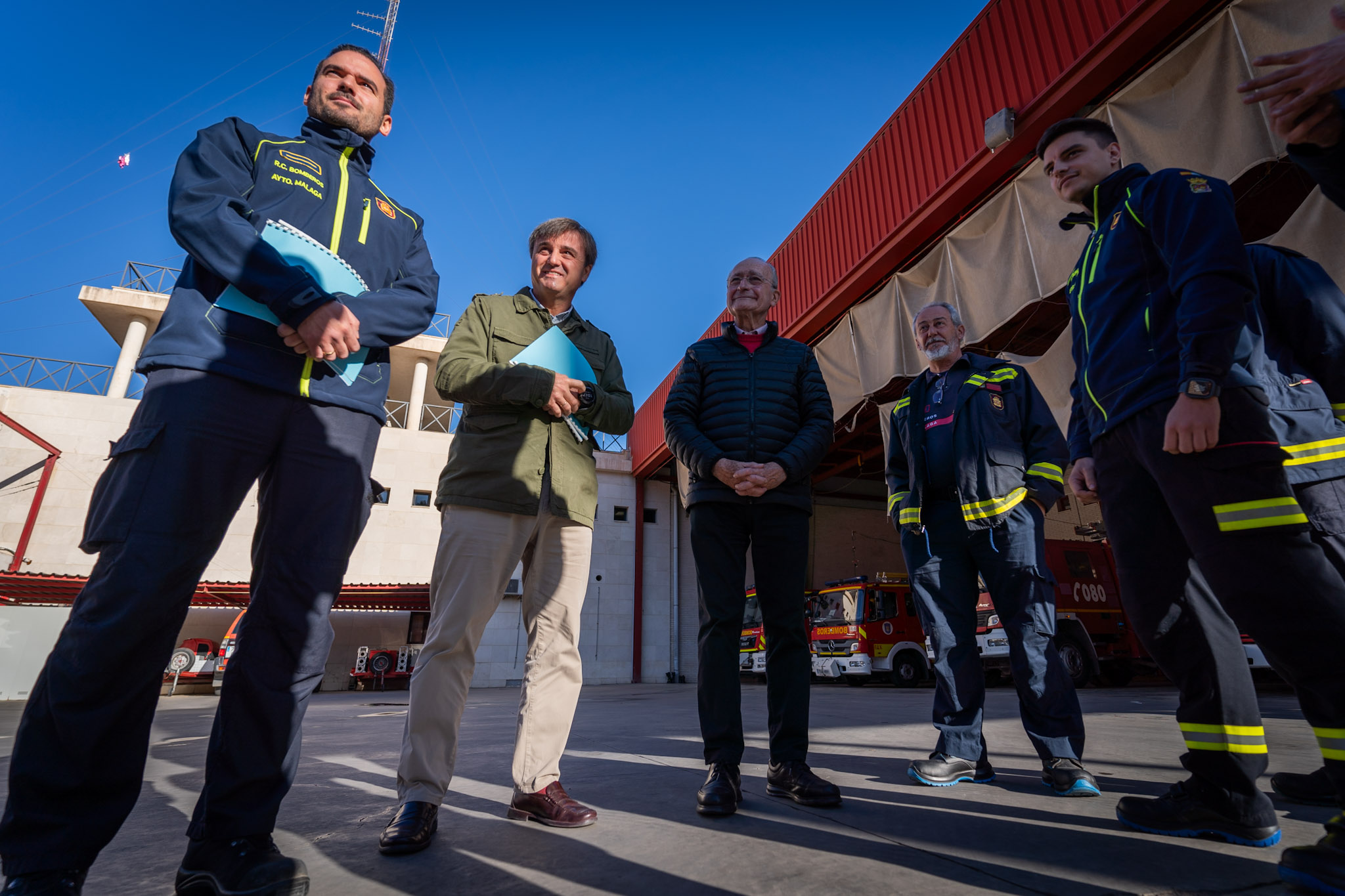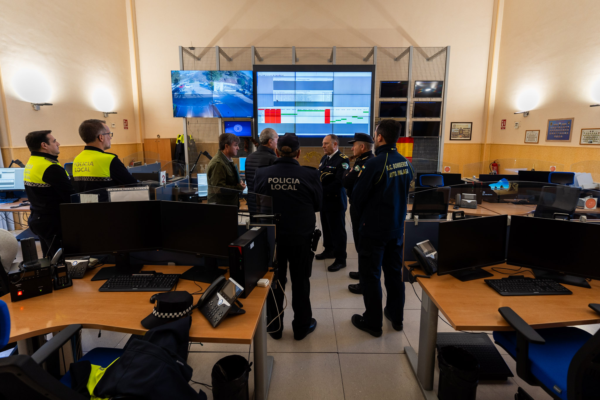 El alcalde de Málaga, Francisco de la Torre, acompañado por el concejal delegado de Seguridad, Avelino Barrionuevo, ha visitado esta mañana, como cada año, las instalaciones de Policía Local y Bomberos con motivo de la Nochebuena. Este recorrido ha comenzado en el Centro Municipal de Emergencias, situado en el Limonar.
