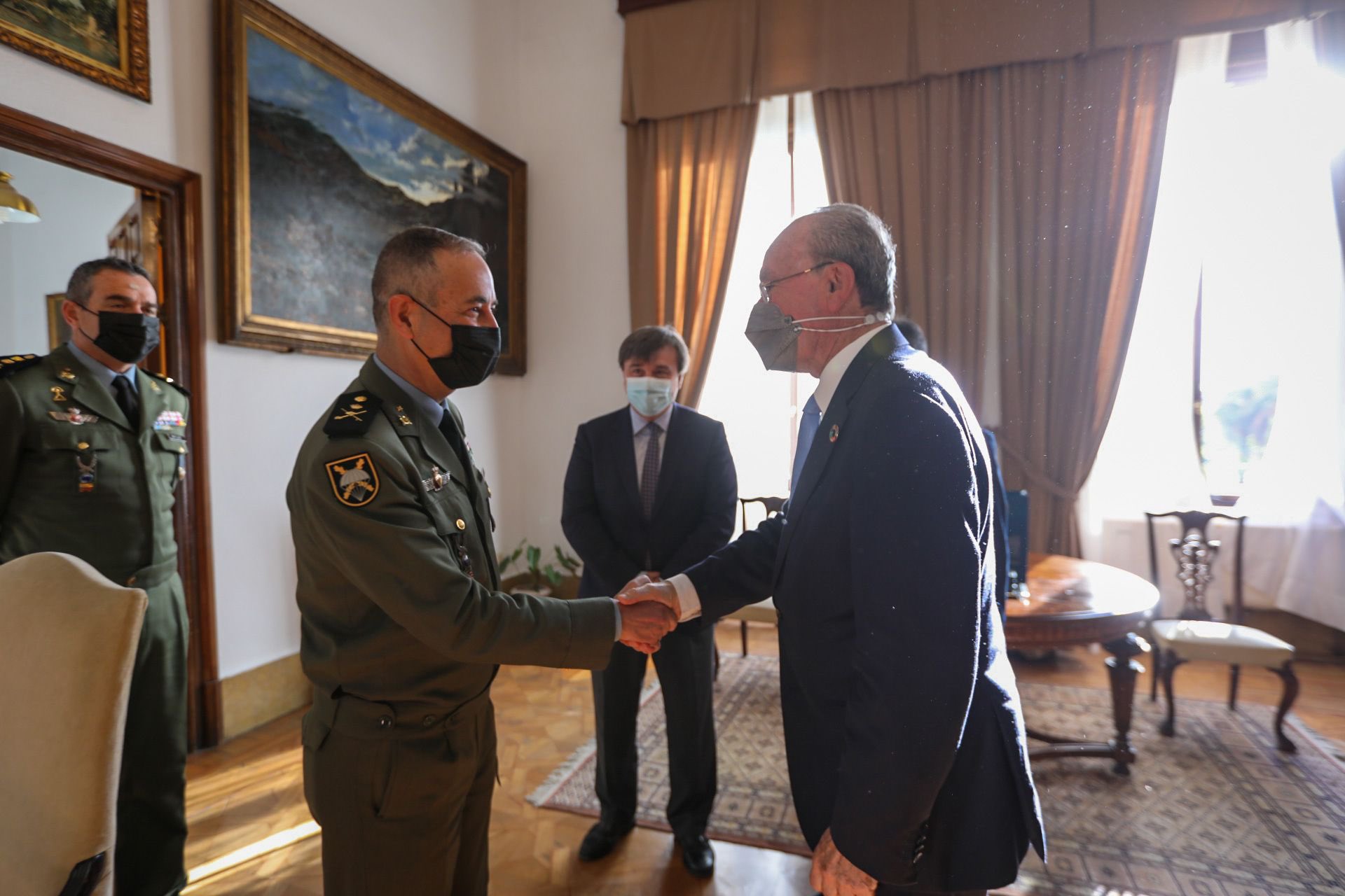 El alcalde de Málaga, Francisco de la Torre, ha recibido en el Ayuntamiento a la Brigada Paracaidista del Ejército de Tierra, acompañado por el concejal de Seguridad, antes de iniciar su desfile hacia la iglesia de San Juan de las Reales Cofradías Fusionadas, esta mañana de Miércoles Santo. Al acto ha asistido el General Jefe de la Brigada Paracaidista del Ejército de Tierra, Luis Fernández Herrero.